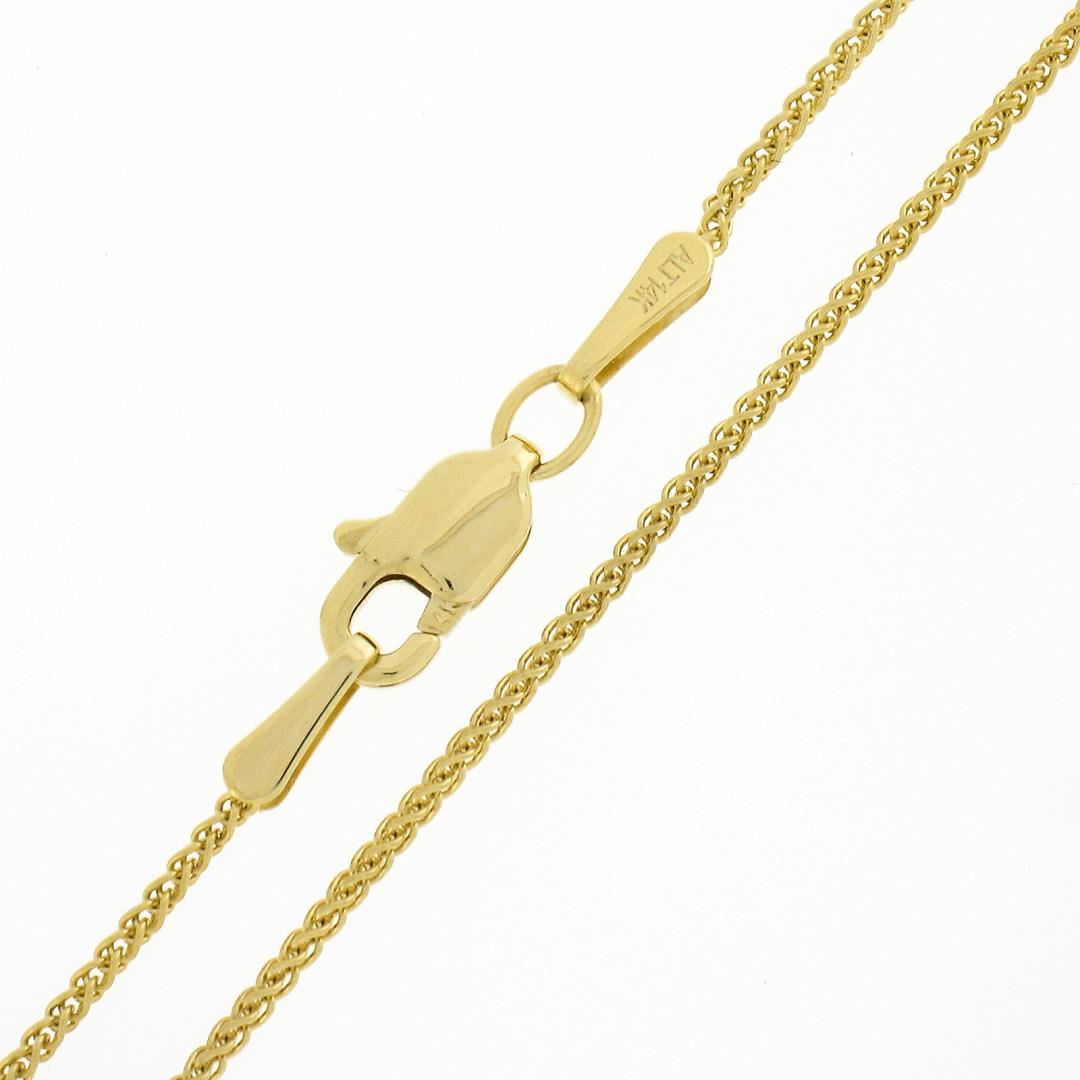 A new solid 14k yellow gold pendant necklace, with 1 pear cut natural imperial topaz (1.50ct), and 1 round brilliant cut natural diamond (F - VS2 ; 0.06ct). 18 inch wheat link chain, 3.27 grams total weight, pendant measures 25x6.60mm.