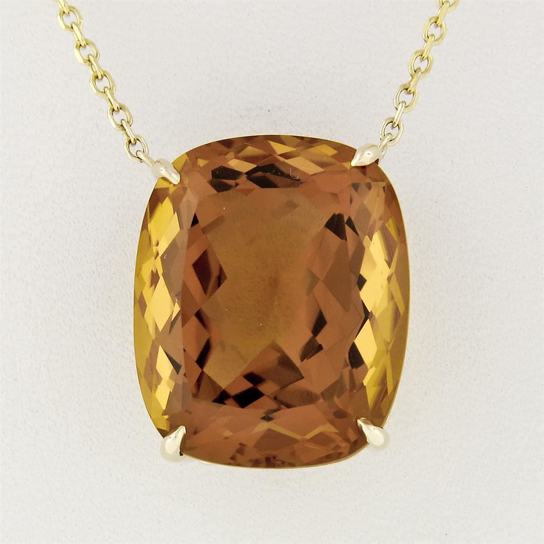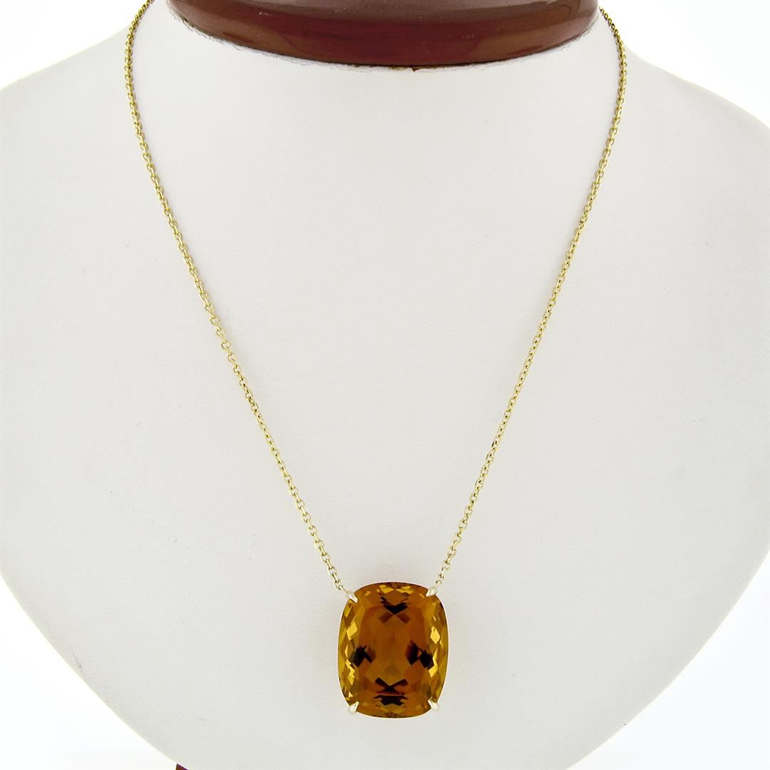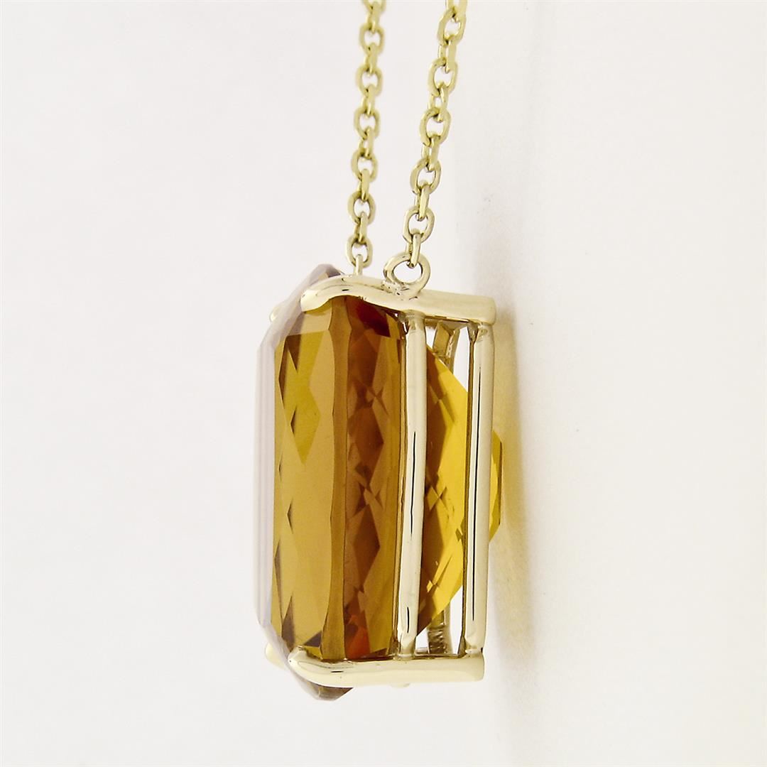 A new solid 14k yellow gold pendant necklace. with 1 cushion cut natural citrine (21.40x17.66mm). The pendant weighs a total of 10.60 grams, measures 21.40x17.66mm including the bail, and 18.5 inch fine beveled cable link chain.