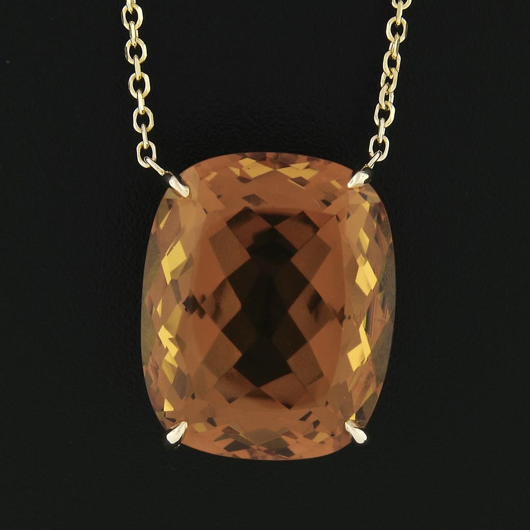 A new solid 14k yellow gold pendant necklace. with 1 cushion cut natural citrine (21.40x17.66mm). The pendant weighs a total of 10.60 grams, measures 21.40x17.66mm including the bail, and 18.5 inch fine beveled cable link chain.