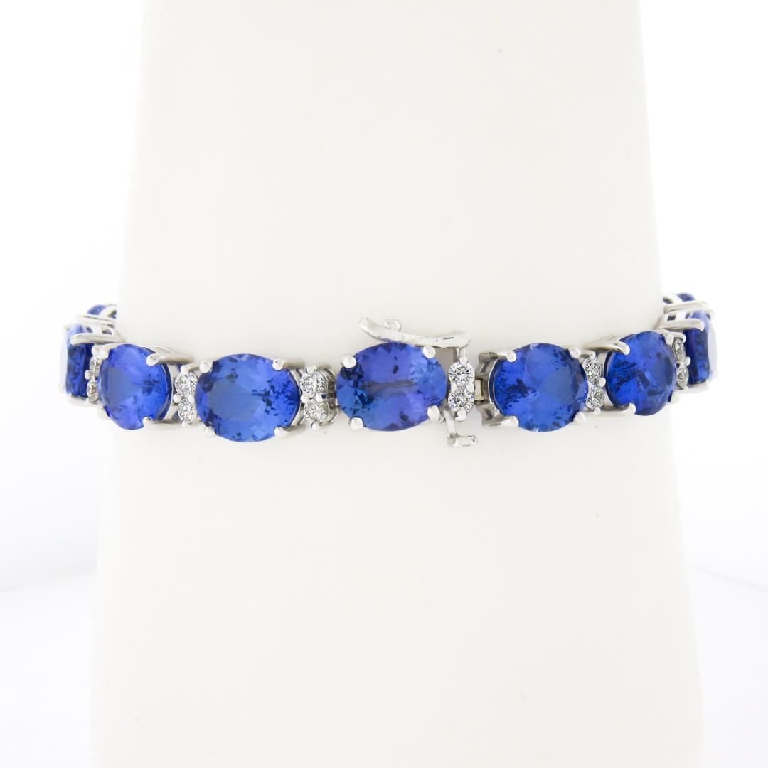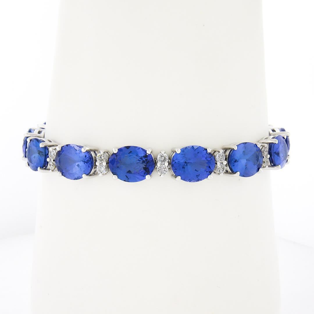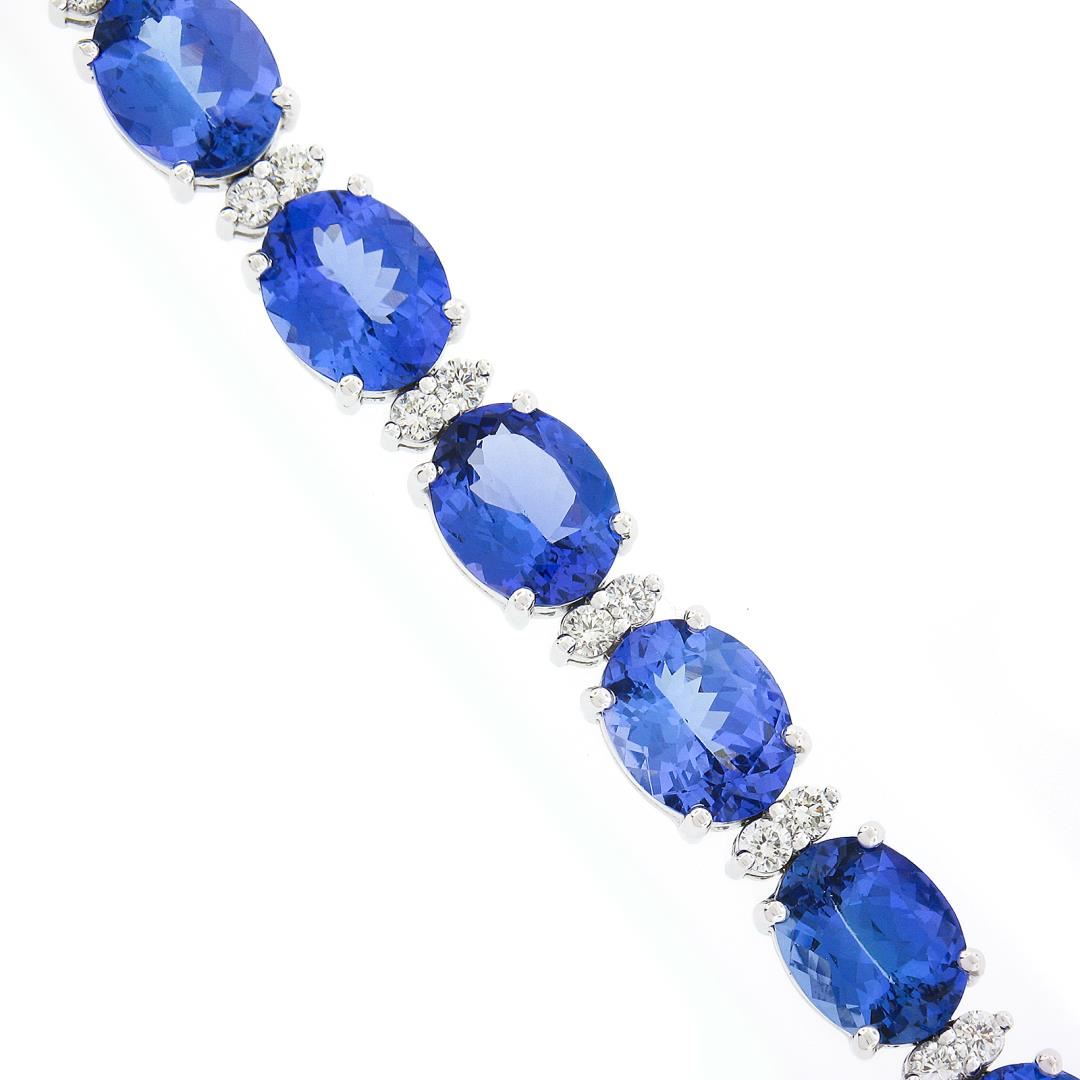 A new solid 14k white gold tennis bracelet, with aleternating 28 round brilliant cut natural diamonds (G/H - VS1/VS2; 1.51ctw), and 14 oval cut natural tanzanites (36.20ctw). It weighs a total of 21.52 grams, measures 8mm wide, and measures 6.5 inches in length.