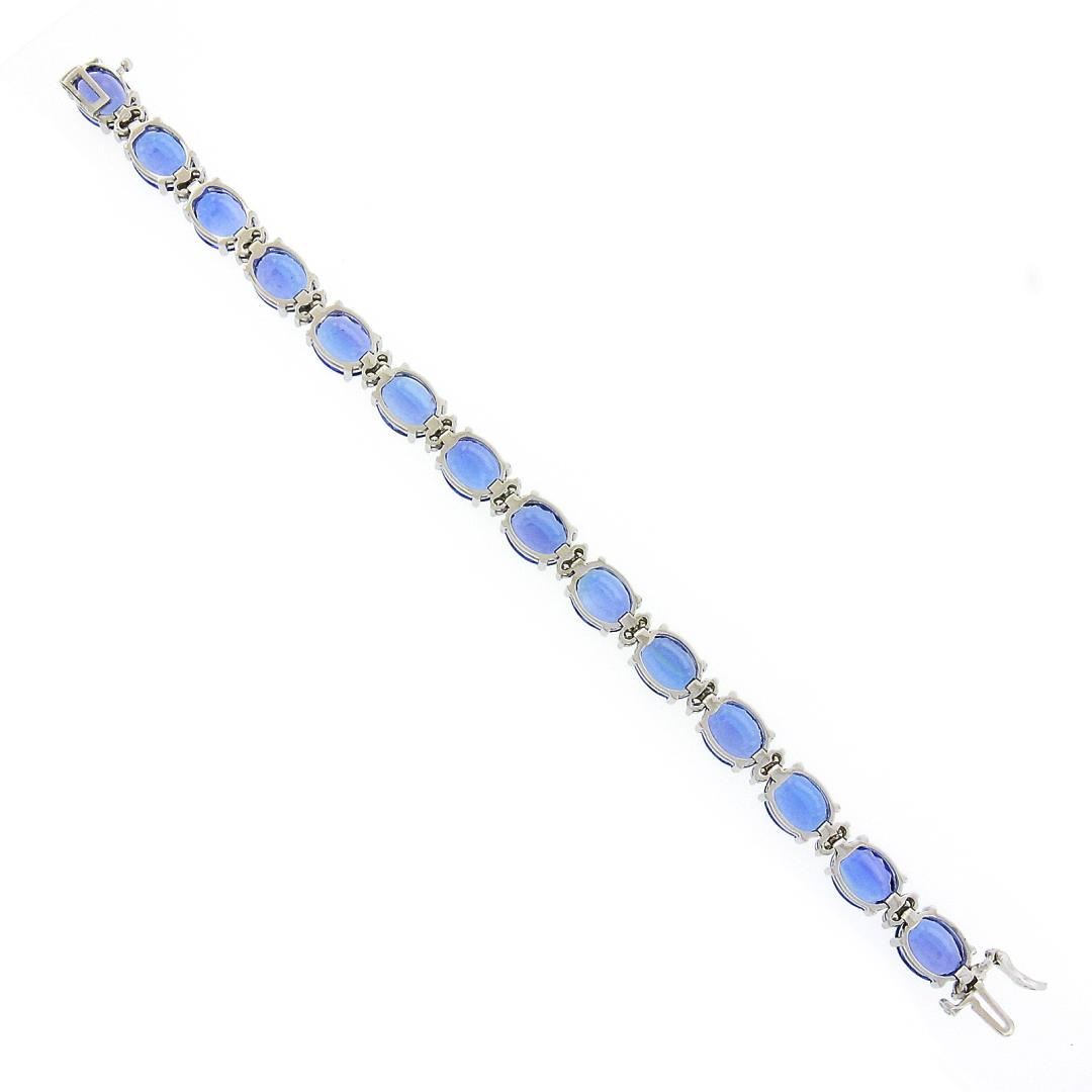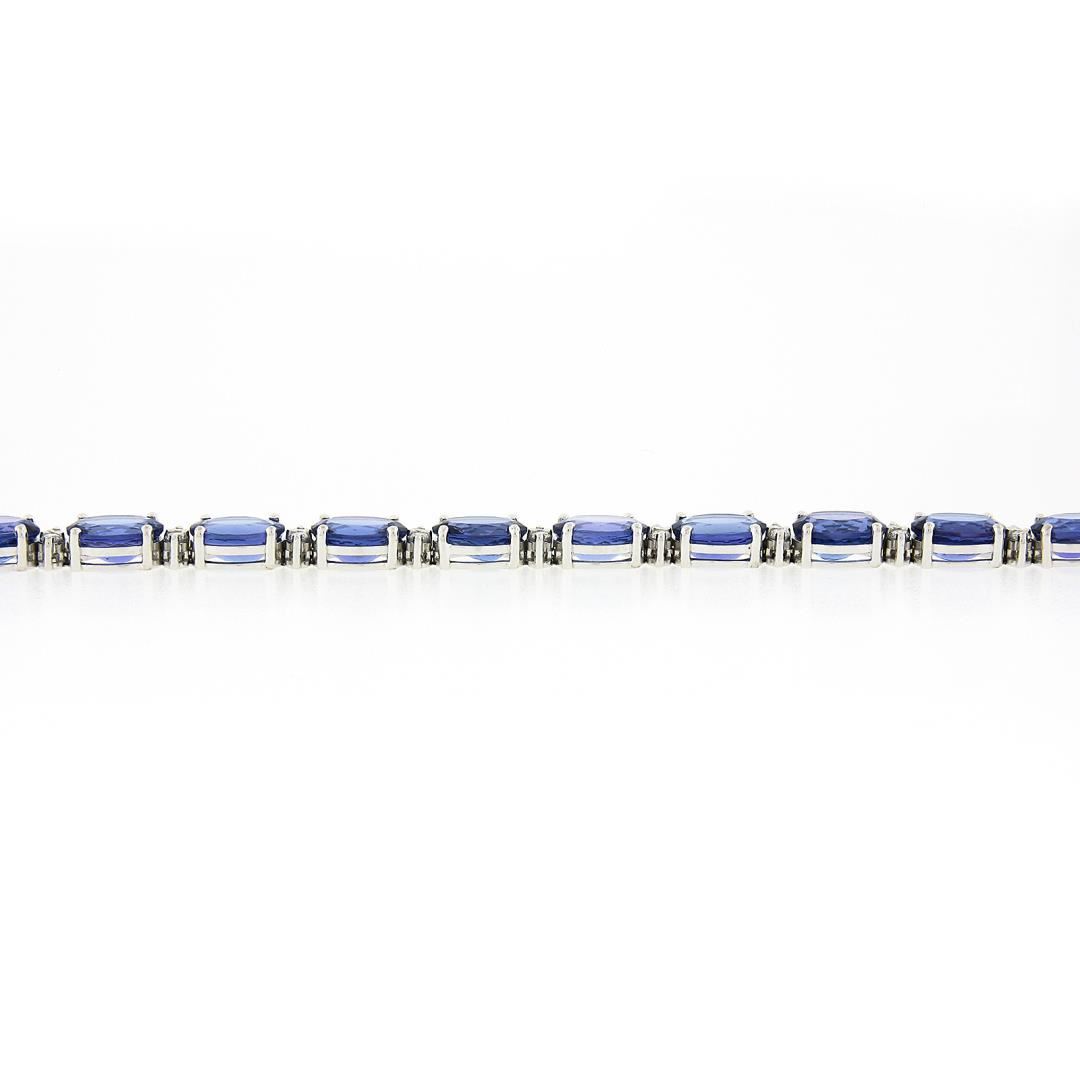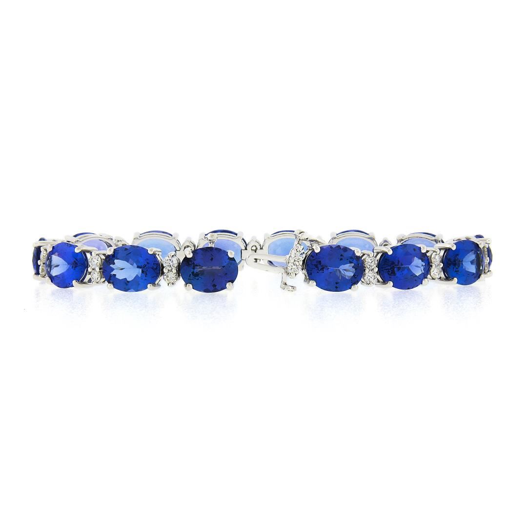 A new solid 14k white gold tennis bracelet, with aleternating 28 round brilliant cut natural diamonds (G/H - VS1/VS2; 1.51ctw), and 14 oval cut natural tanzanites (36.20ctw). It weighs a total of 21.52 grams, measures 8mm wide, and measures 6.5 inches in length.