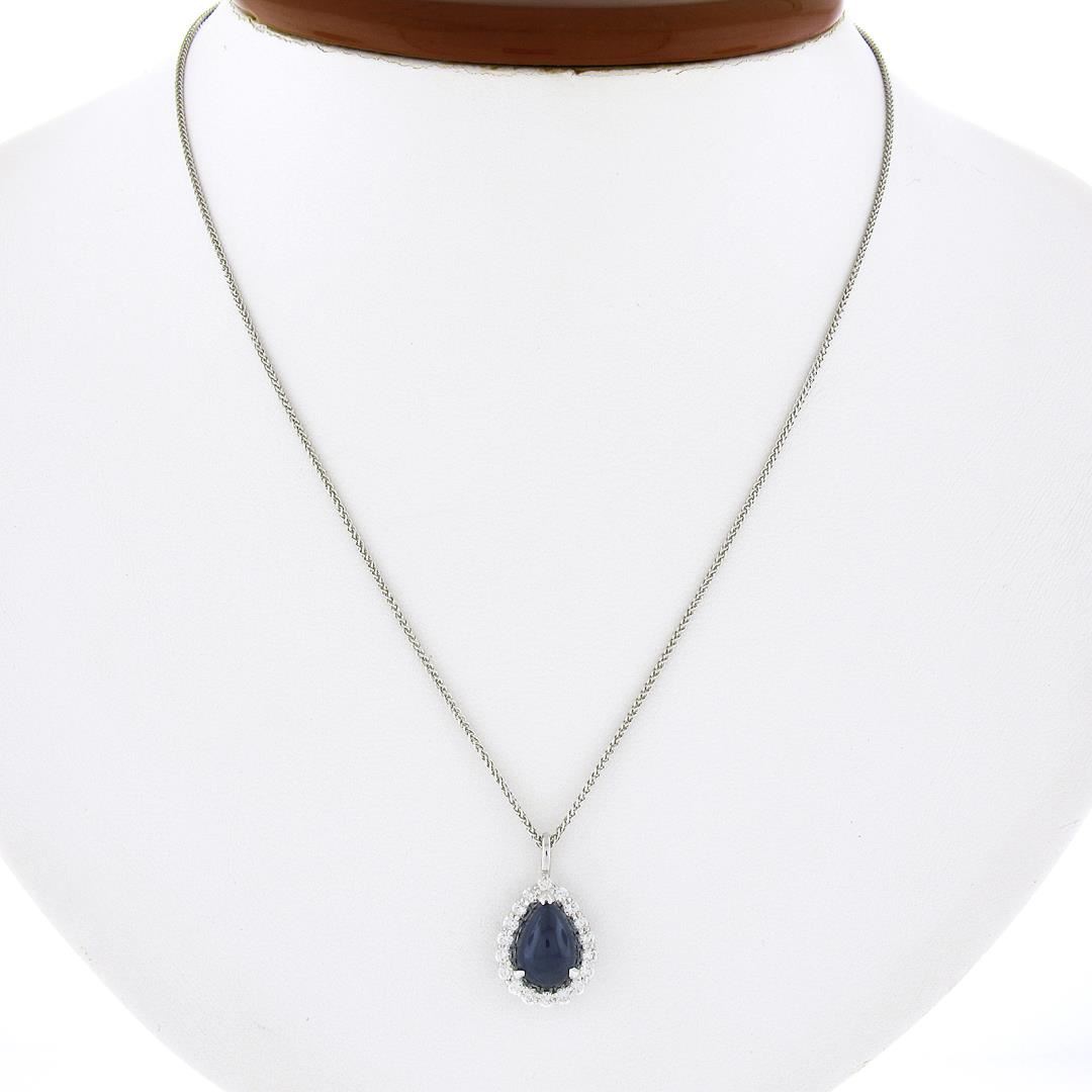 A new solid 14k white gold teardrop pendant necklace, with 1 Gubelin graded pear cabochon cut natural sapphire (3.02ct ), with a halo of 18 round brilliant cut natural diamonds (G/H - VS2/SI1 ; 0.34ctw). 18 inch wheat link chain, 3.90 grams total weight, pendant measures 19x11.10mm. Comes with all original relevant certifications.