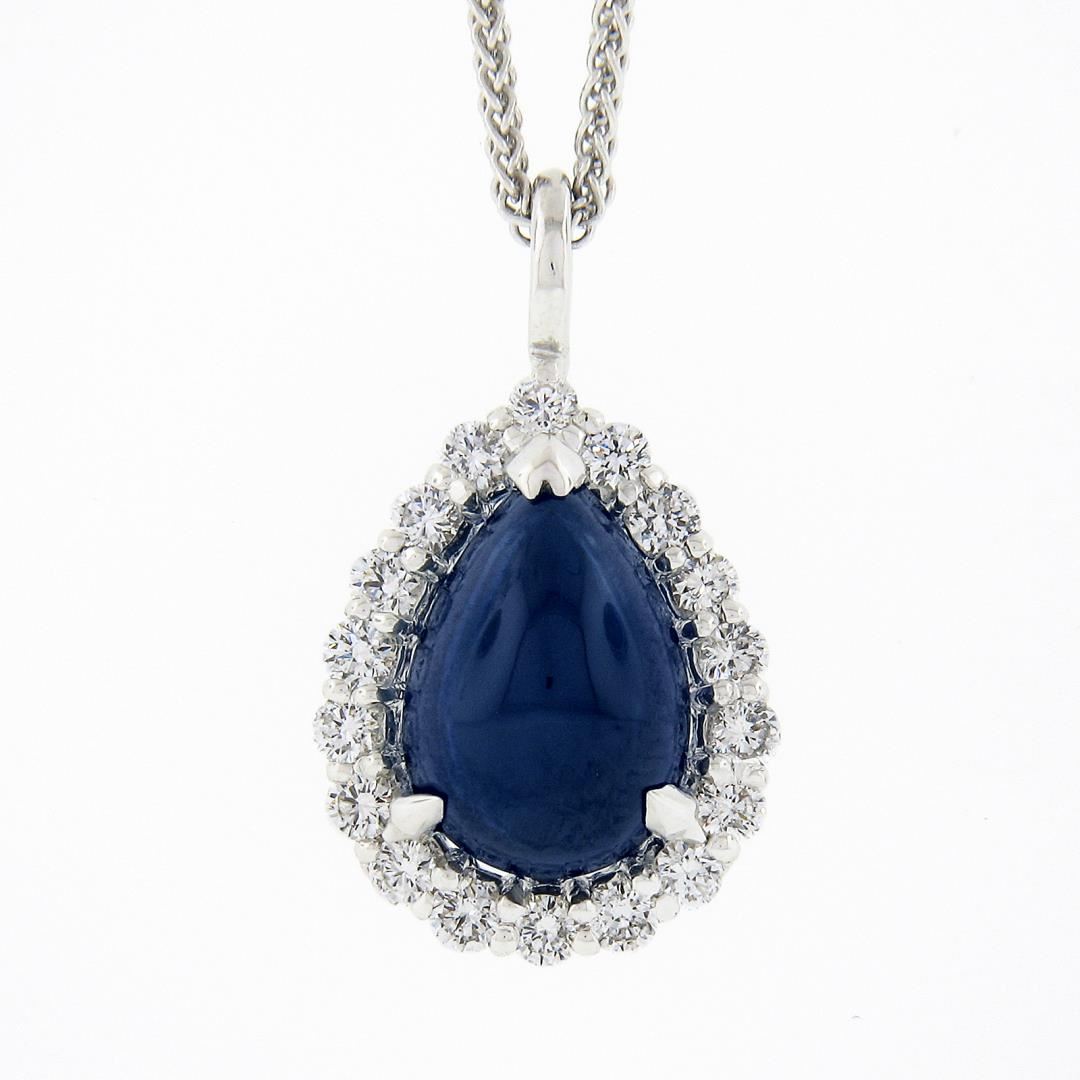 A new solid 14k white gold teardrop pendant necklace, with 1 Gubelin graded pear cabochon cut natural sapphire (3.02ct ), with a halo of 18 round brilliant cut natural diamonds (G/H - VS2/SI1 ; 0.34ctw). 18 inch wheat link chain, 3.90 grams total weight, pendant measures 19x11.10mm. Comes with all original relevant certifications.