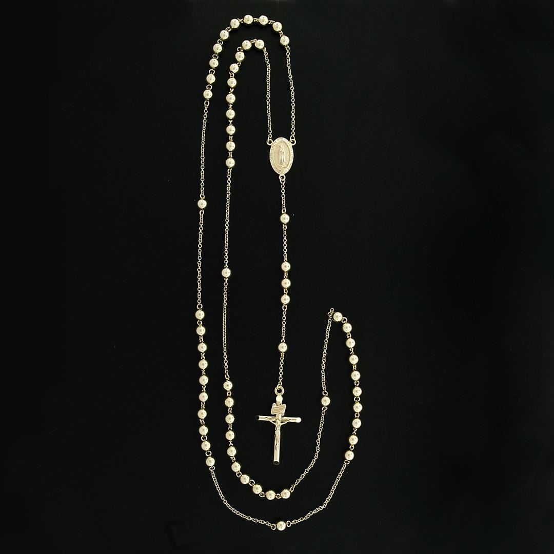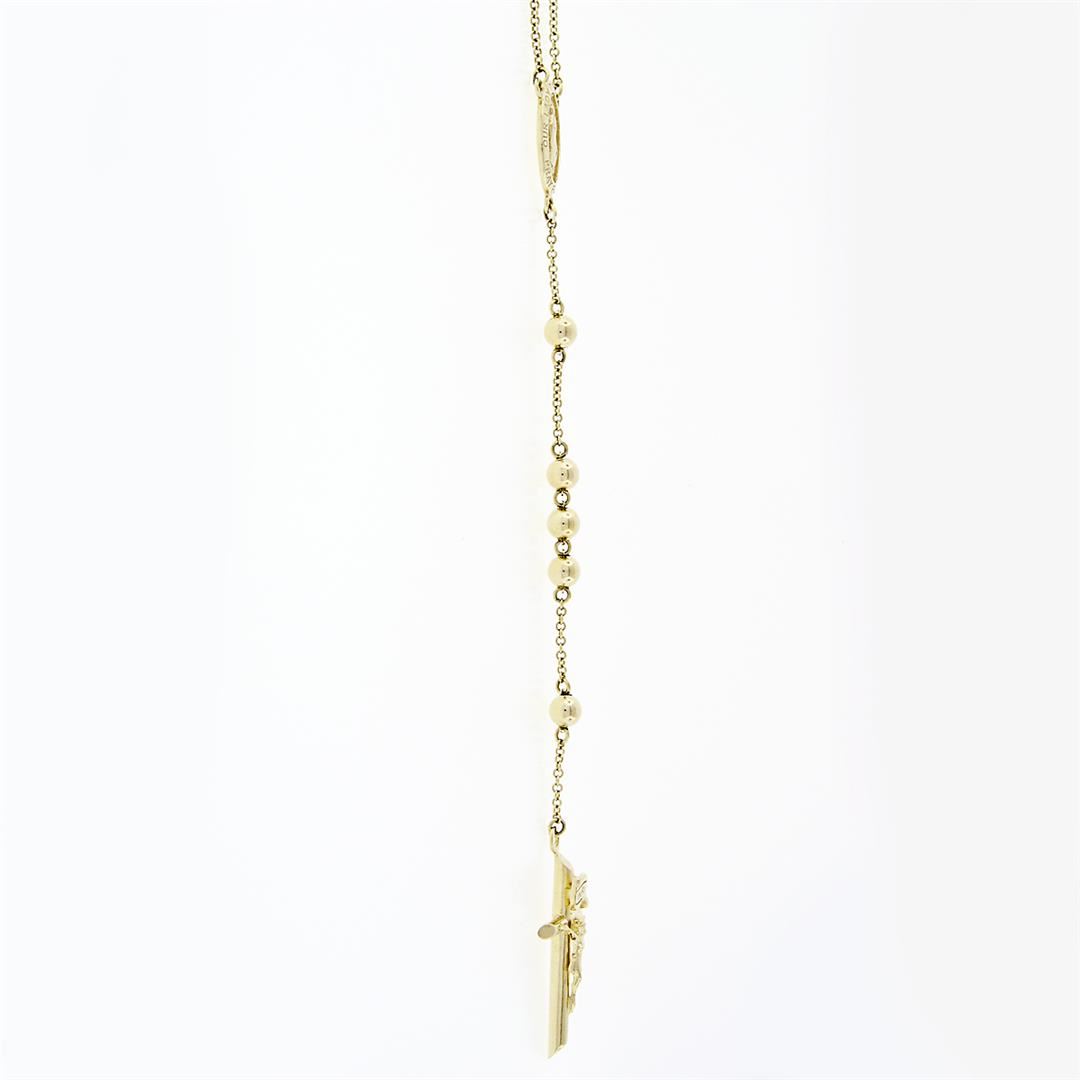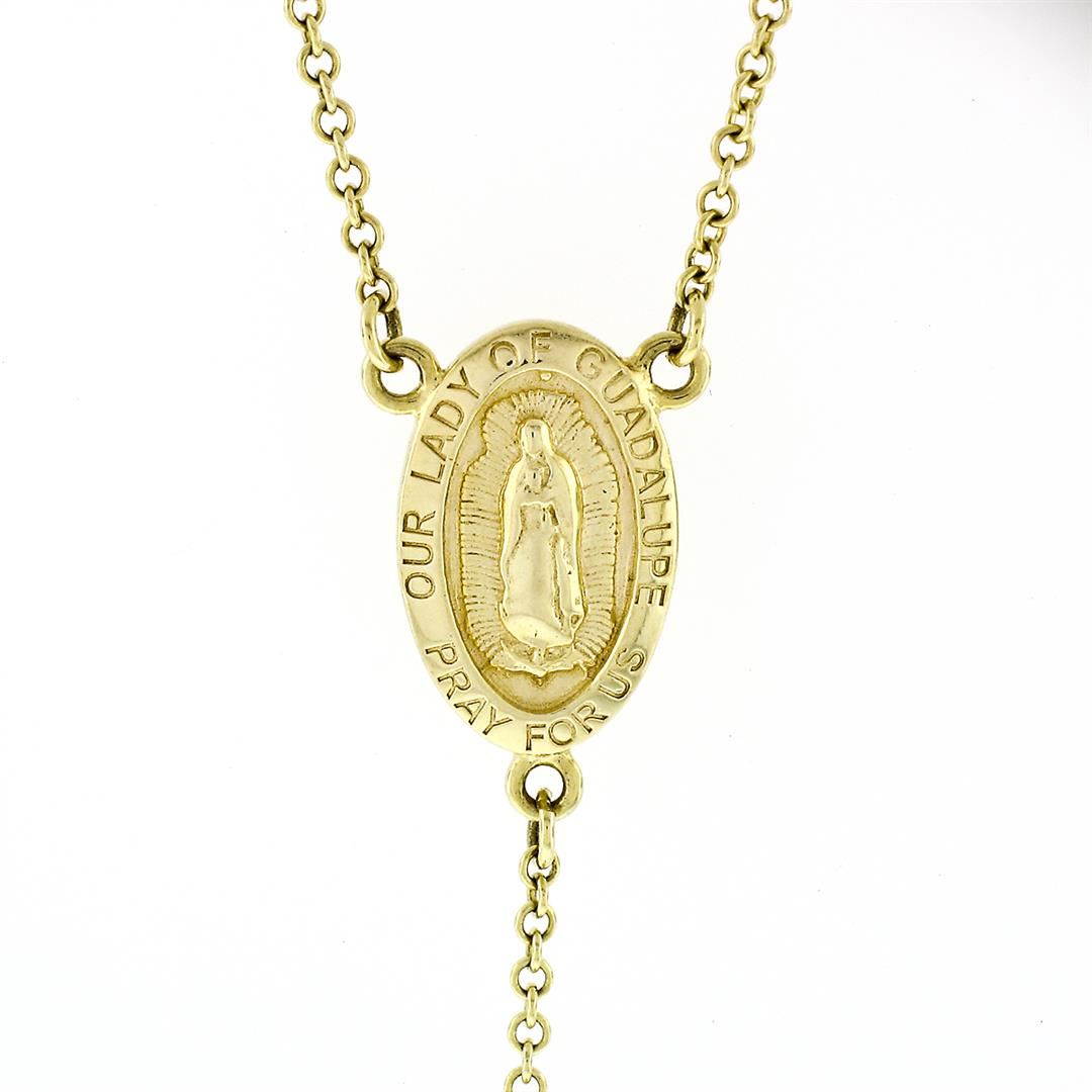 A new solid 14k yellow gold rosary necklace. 26 inch squared cable link chain, 11.19 grams total weight, dangle measures 4.5 inch.
