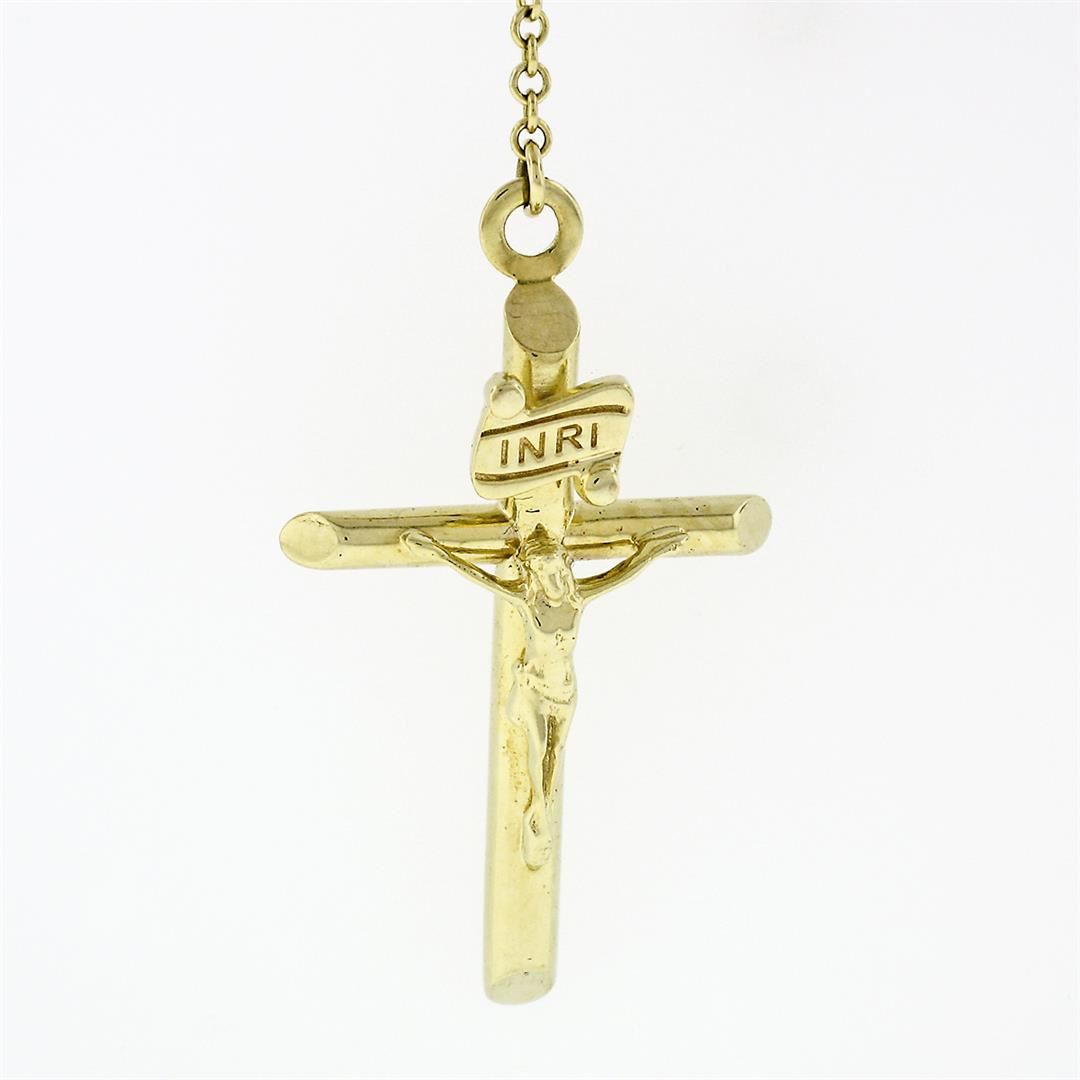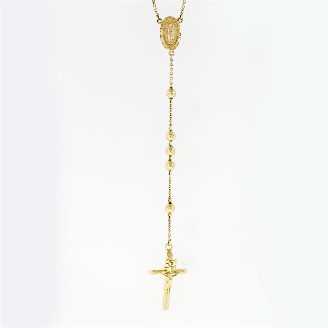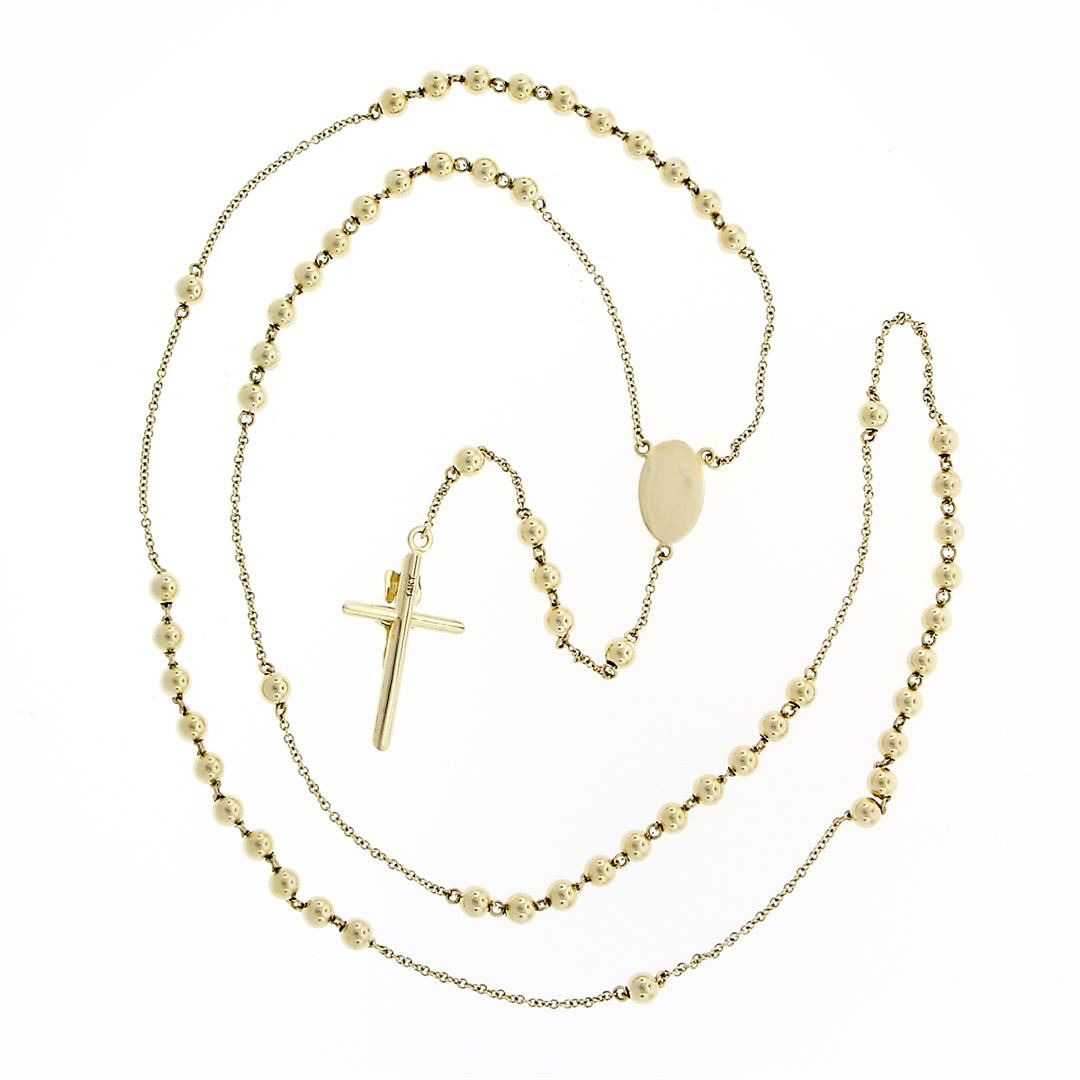A new solid 14k yellow gold rosary necklace. 26 inch squared cable link chain, 11.19 grams total weight, dangle measures 4.5 inch.