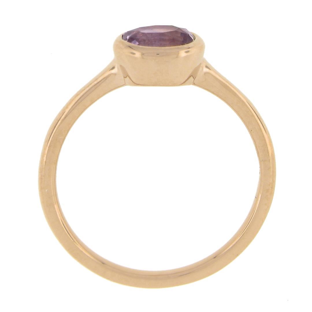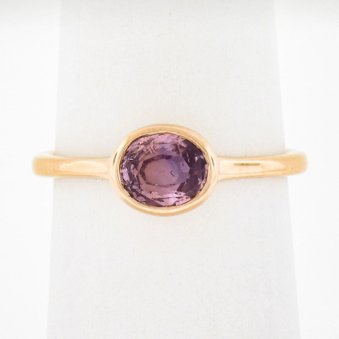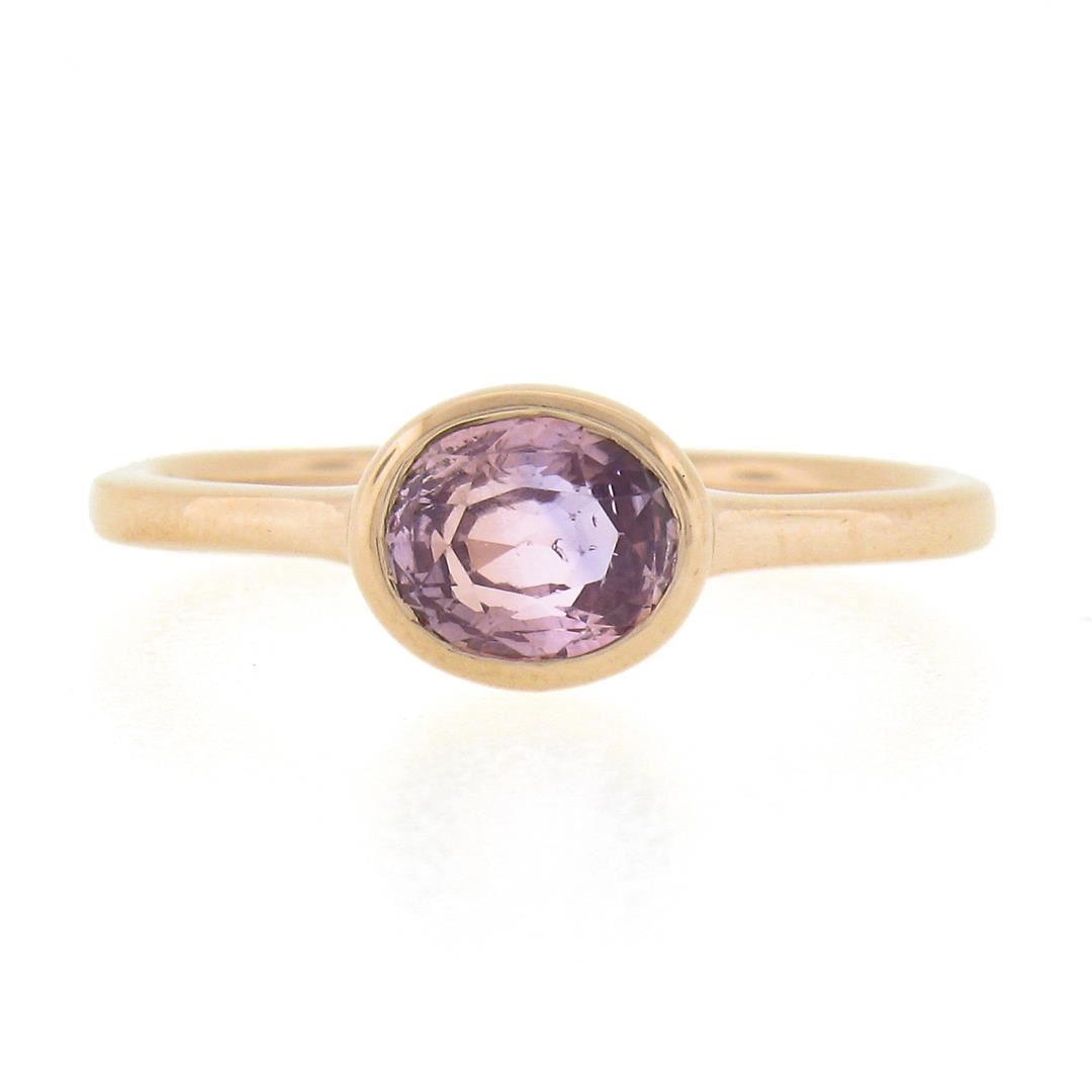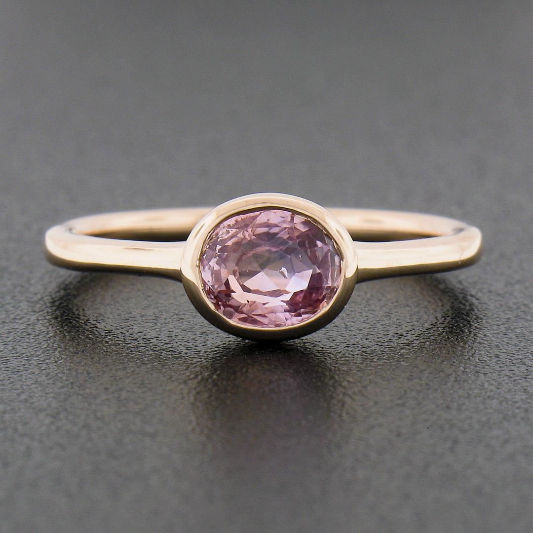 A new solid 14k rose gold ring, with 1 GIA graded oval cut natural pink sapphire (1.01ct). The ring is size 6.5, weighs a total of 2.34 grams, and measures 6.5mm wide. Comes with all original relevant certifications.