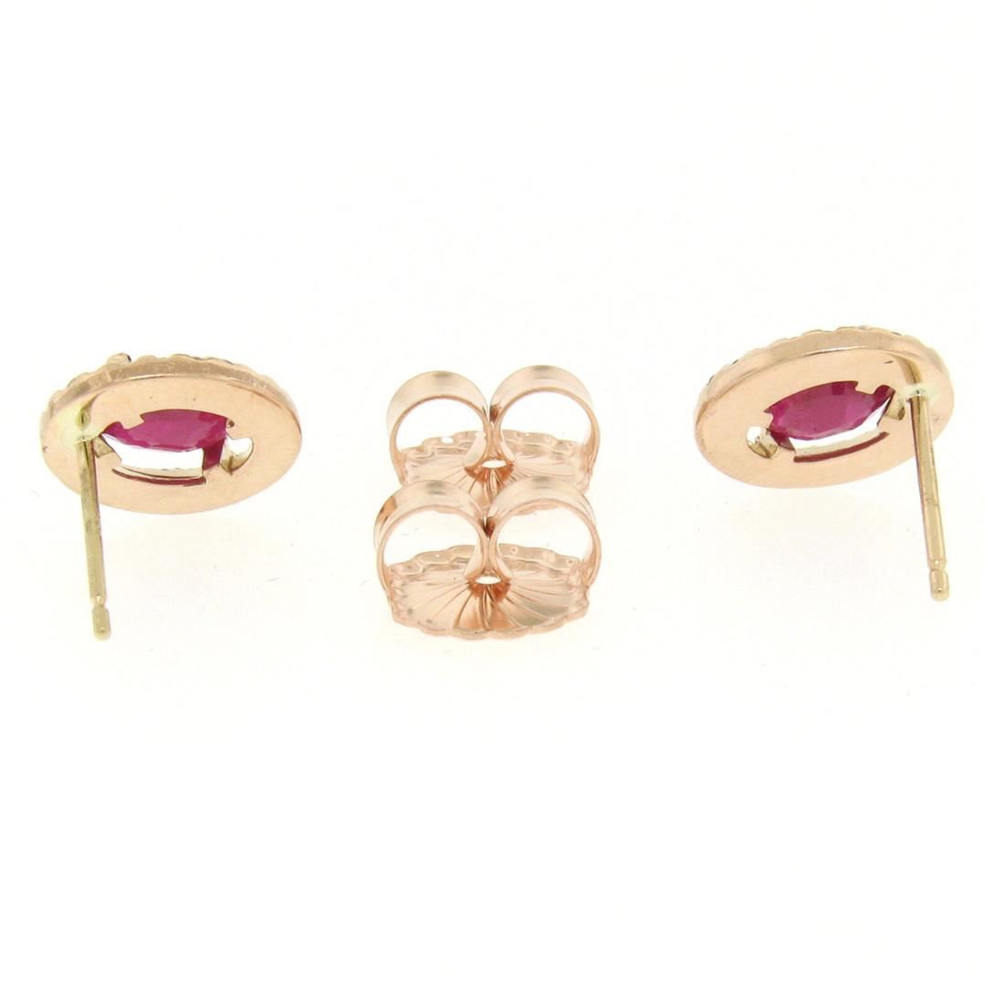 A new solid 14k rose gold pair of stud earrings, featuring 2 oval cut natural rubies (2.19ctw), surrounded with a halo of 42 round brilliant cut natural diamonds (G- VS2; 0.35ctw). The earrings measure approximately 11.60x9.59mm and weigh a total of 3.5 grams.