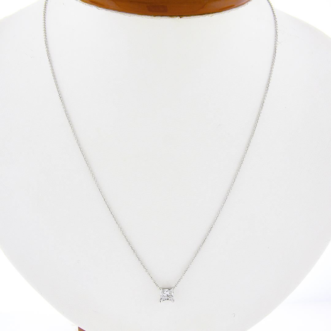 A new solid 14k white gold pendant necklace, with 1 princess cut natural diamond (G - I1 ; 0.48ct). Adjustabel 16 & 18 inch cable link chain, 2.06 grams total weight, pendant measures 5.8x6mm.