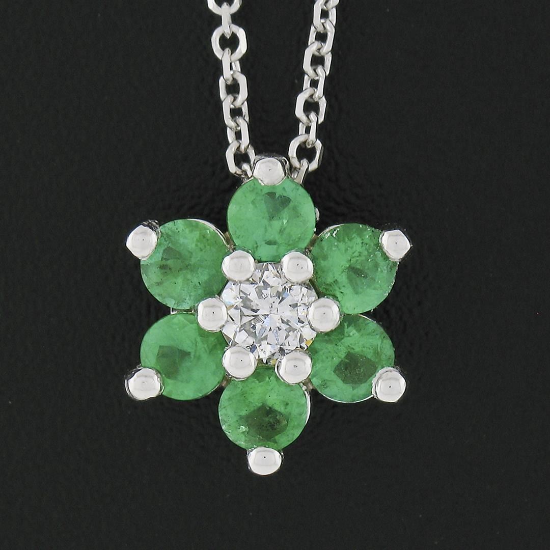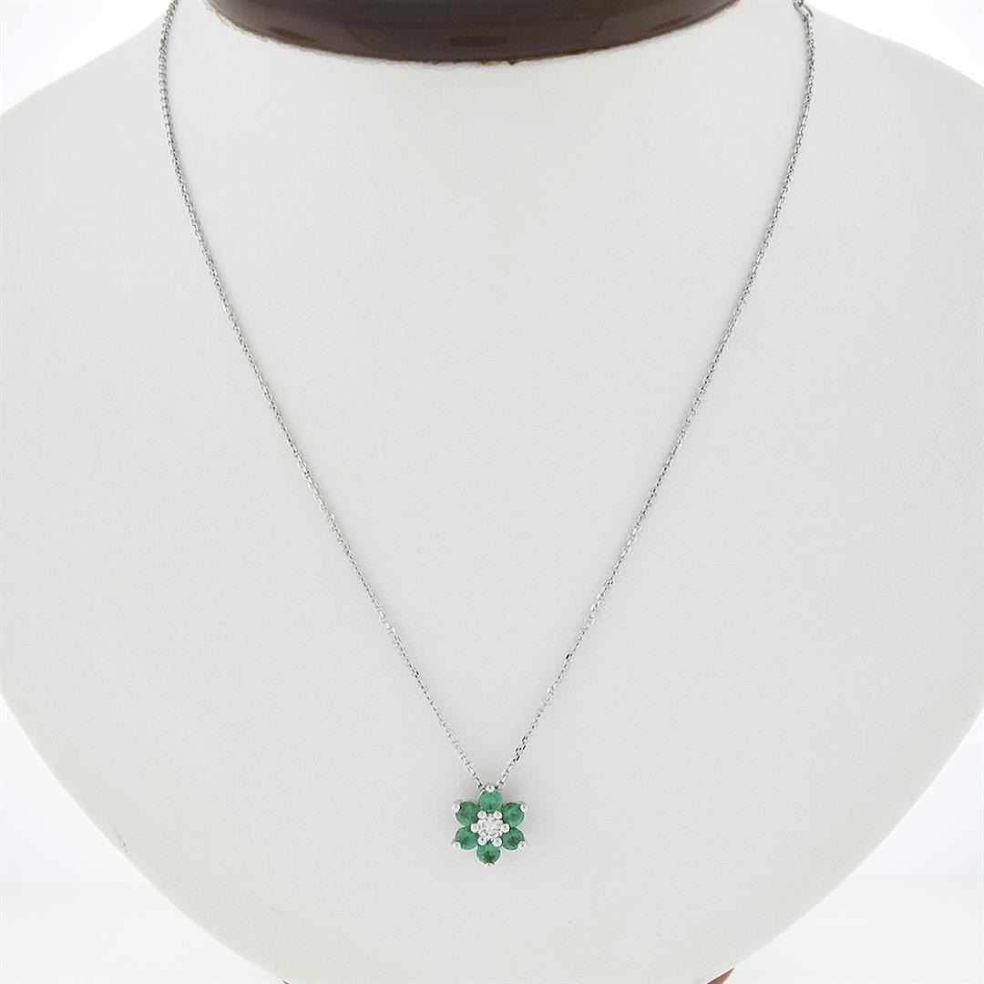 A new solid 14k white gold flower pendant necklace, with 1 round brilliant cut natural diamond (H - SI1 ; 0.20ct), surrounded with a halo of 6 round brillliant cut natural emeralds ( 0.63ctw). adjustable at 14 & 16 inch cable link chain, 3.27 grams total weight, pendant measures 9.85mm in diameter.