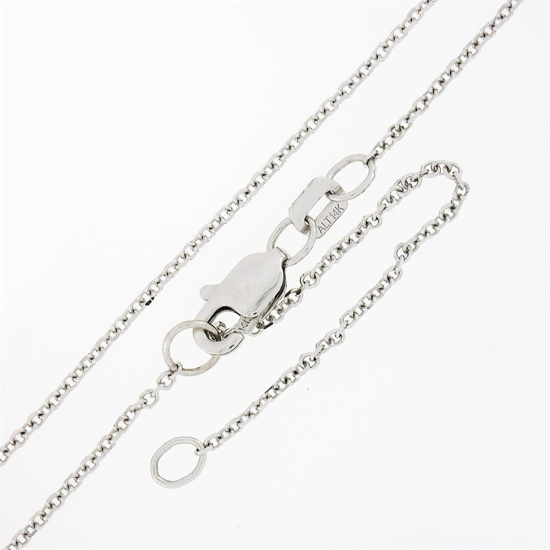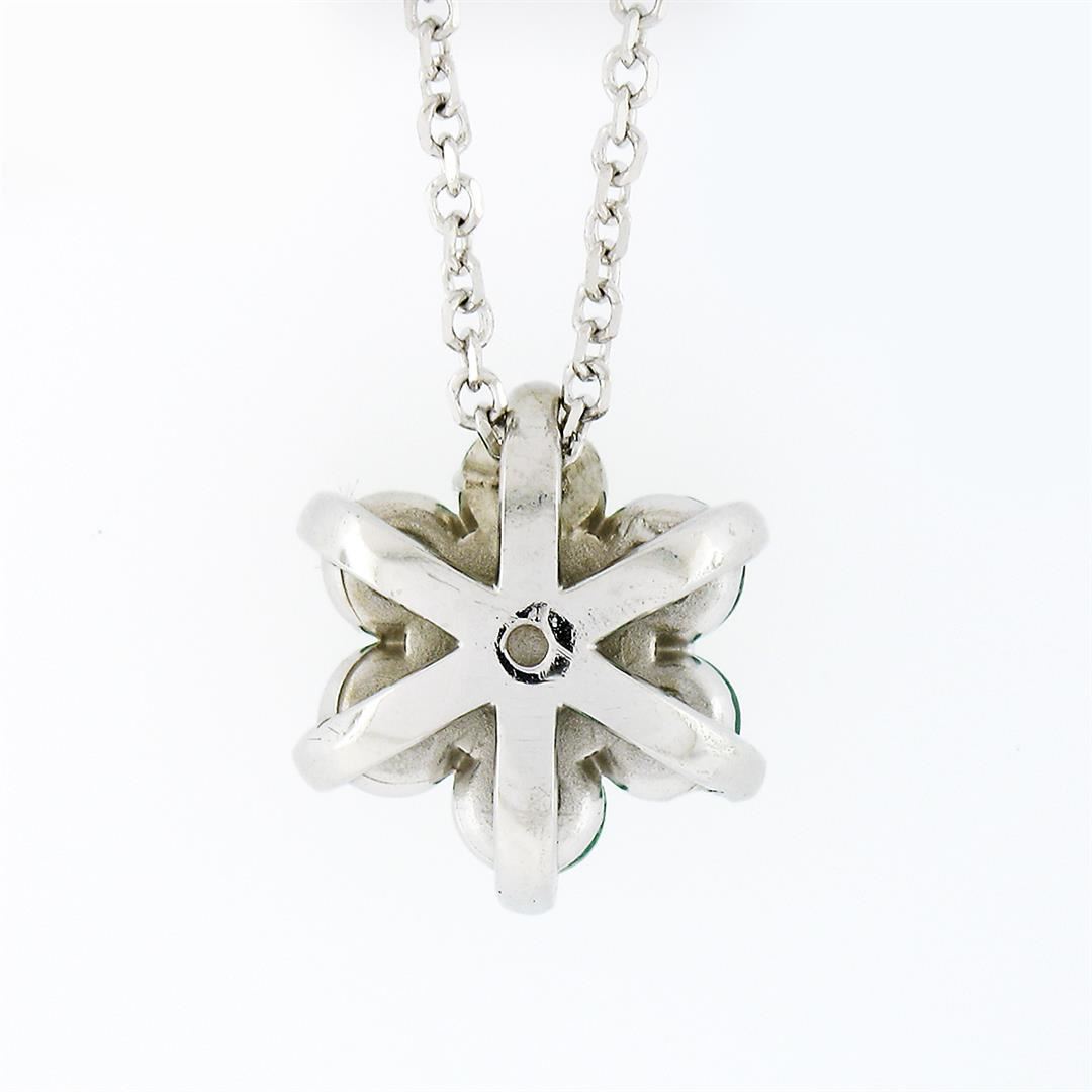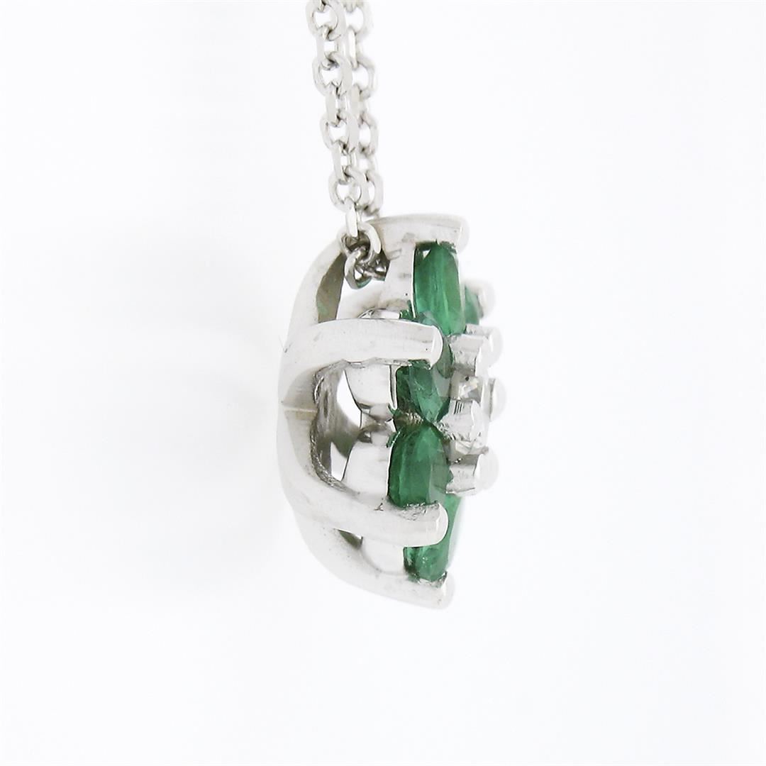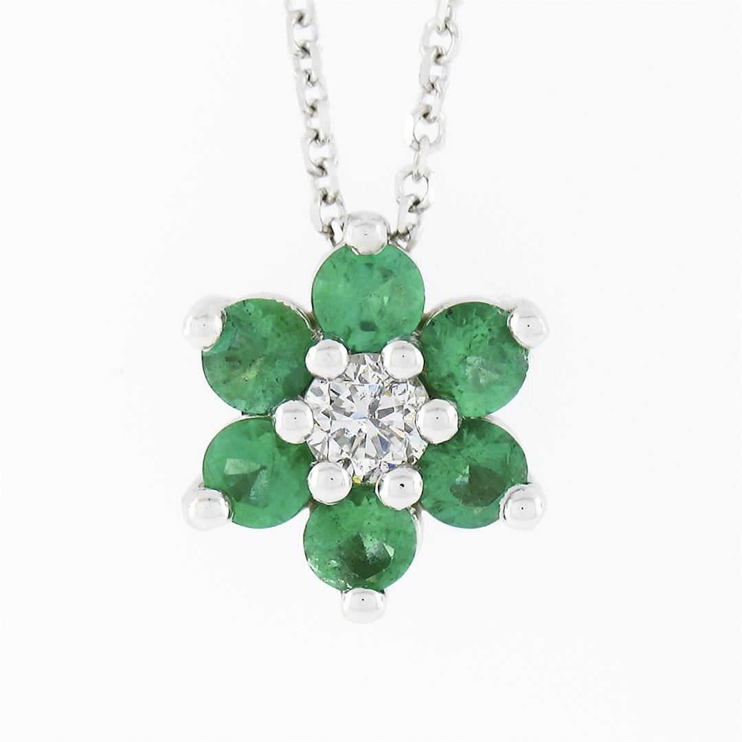 A new solid 14k white gold flower pendant necklace, with 1 round brilliant cut natural diamond (H - SI1 ; 0.20ct), surrounded with a halo of 6 round brillliant cut natural emeralds ( 0.63ctw). adjustable at 14 & 16 inch cable link chain, 3.27 grams total weight, pendant measures 9.85mm in diameter.