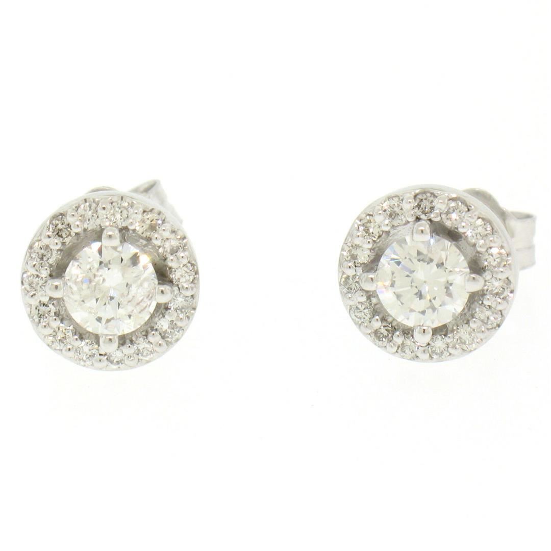 One NEW 14k White Gold 1.06ctw Round Brilliant Diamond Stud Earrings w/ Pave Halos. Item Details: Material: 14k Solid White Gold, Weight: 2.1 Grams, Stone(s): (2) Natural Genuine Diamonds - Round Brilliant Cut - Prong Set - SI2/I1 Clarity - G Color - 0.76ctw (approx.), (30) Natural Genuine Diamonds - Round Brilliant Cut - Prong Set - VS2/SI1 Clarity - G/H Color - 0.30ctw (approx.), Total Carat Weight: 1.06 (approx.), Backing: Post Back w/ Butterfly Closure, Diameter: 8.23mm, Thickness: 2.92mm projection off the ear Condition: New w/o Tag