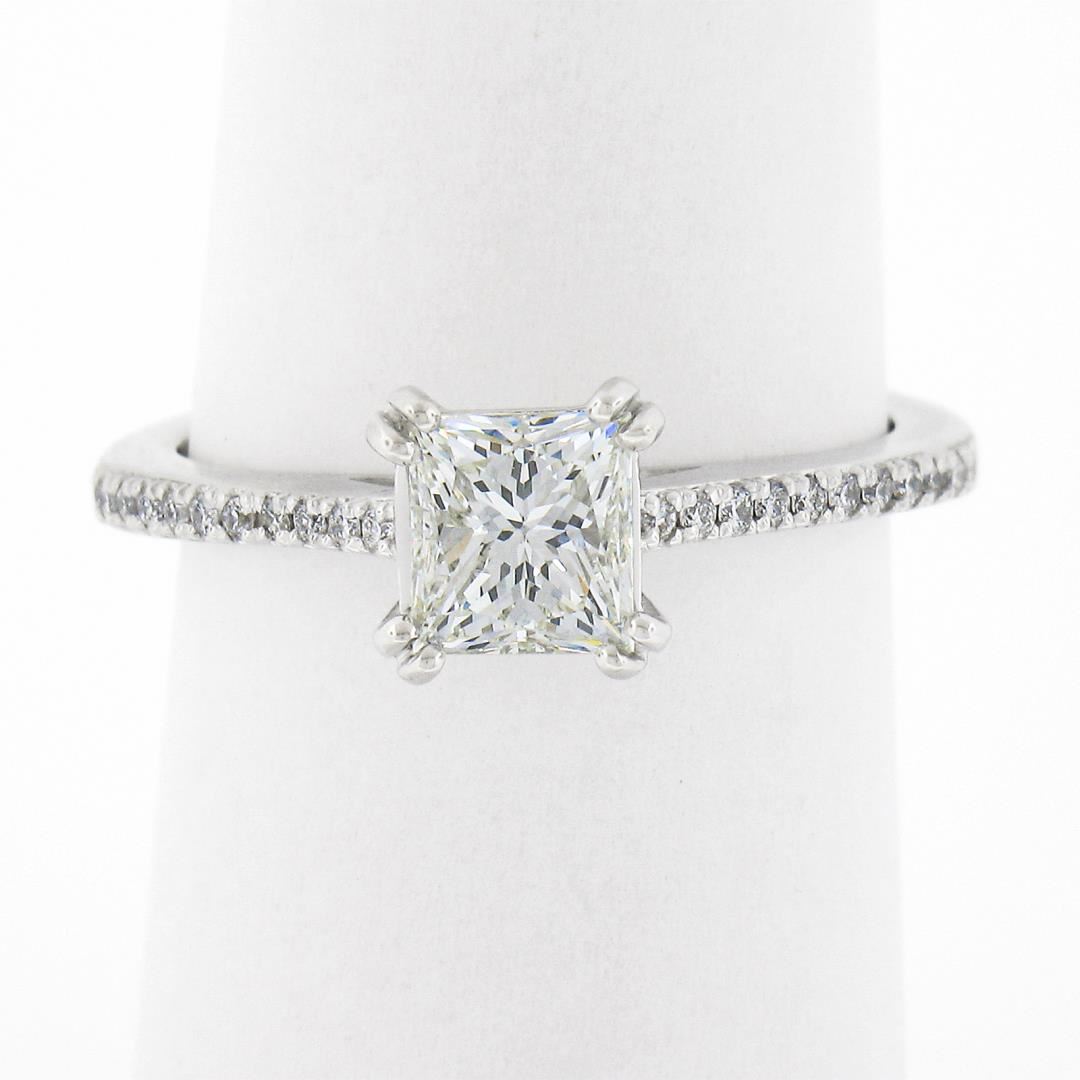 A new solid 14k white gold engagement ring, with 1 GIA graded princess cut natural diamond (L - VS1 ; 1.01ct ), and 22 round brilliant cut natural diamonds (G/H - VS1/VS2 ; 0.11ctw). The ring is size 6.0, weighs a total of 3.35 grams, and measures 6.9mm wide. Comes with all original relevant certifications.