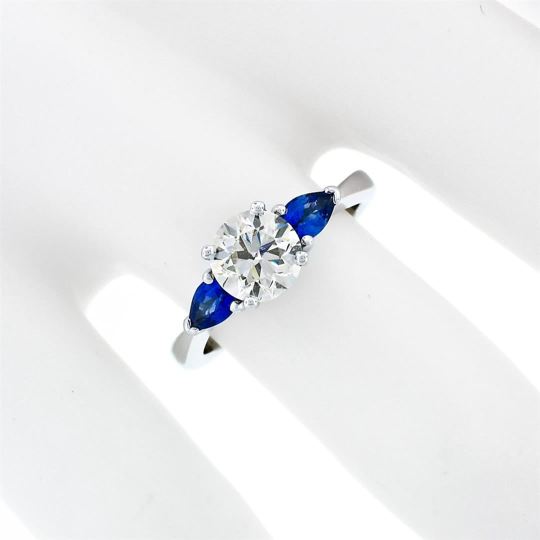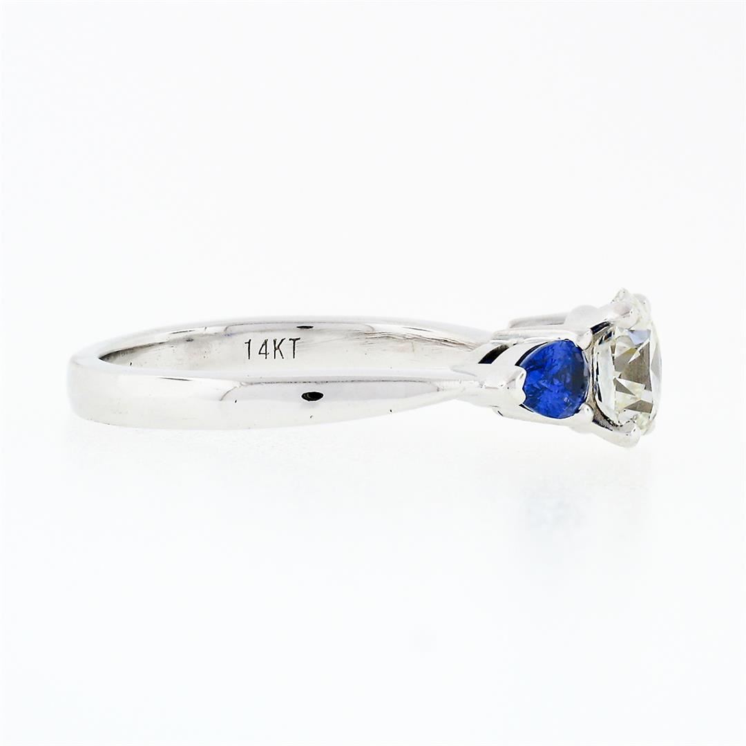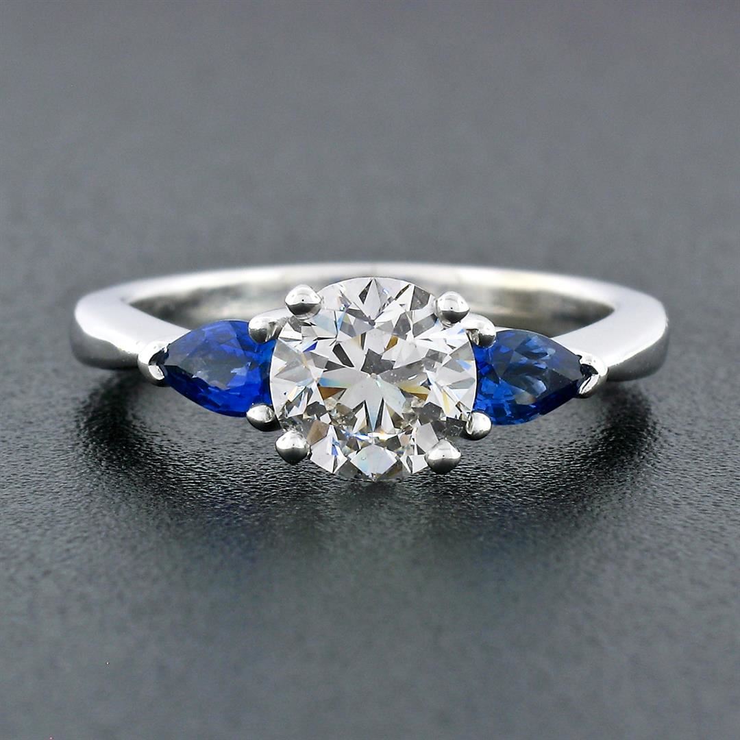 A new solid 14k white gold three-stone engagement ring with 1 GIA certified round brilliant cut natural diamond solitaire (G - VS2; 1.03ct) flanked by 2 pear cut rich blue natural sapphires (0.44ctw). The ring is size 5.5, weighs a total of 3.22 grams, and measures 6.46mm wide. Comes with all original relevant certifications.