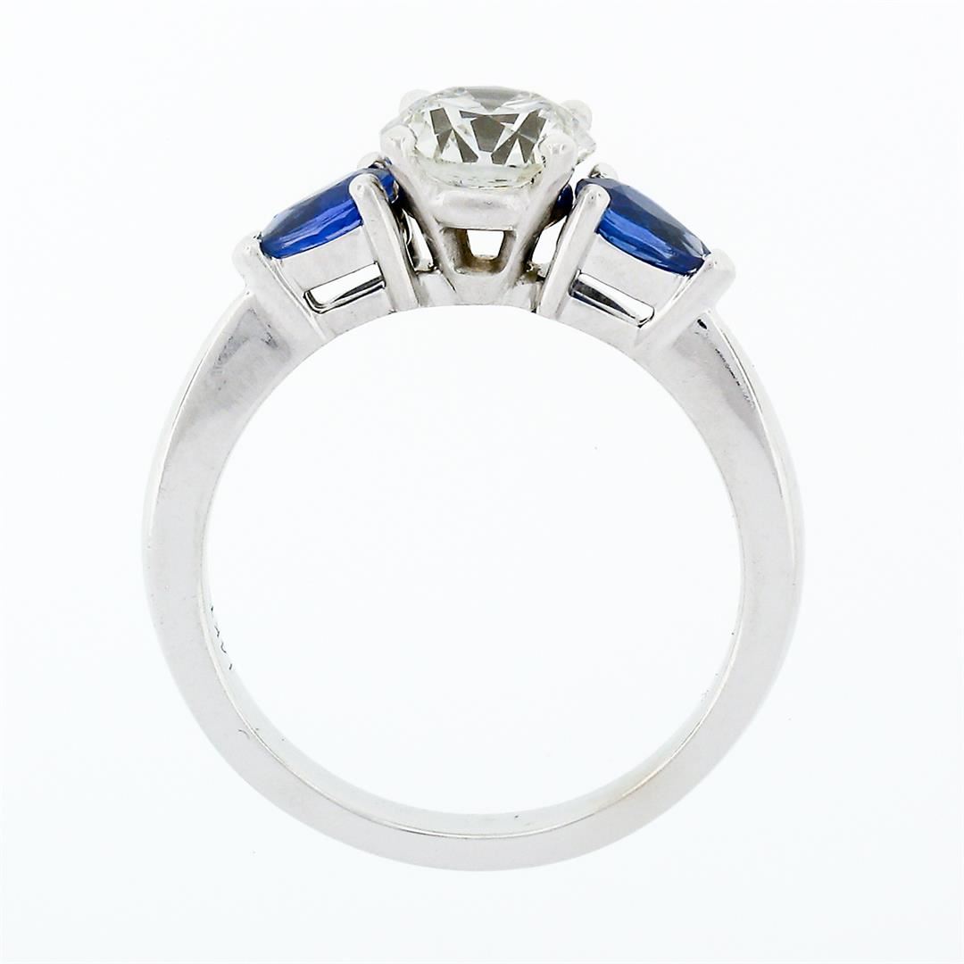 A new solid 14k white gold three-stone engagement ring with 1 GIA certified round brilliant cut natural diamond solitaire (G - VS2; 1.03ct) flanked by 2 pear cut rich blue natural sapphires (0.44ctw). The ring is size 5.5, weighs a total of 3.22 grams, and measures 6.46mm wide. Comes with all original relevant certifications.