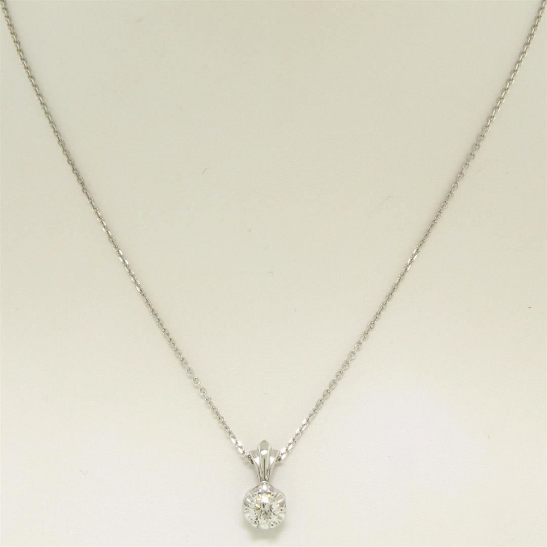 One NEW 14k White Gold .45ct F VS2 Round Brilliant Diamond Solitaire Pendant & Chain. Item Details: Material: 14K Solid White Gold, Weight: 2.60 Grams, Stone(s): (1) Natural Genuine Diamond - Round Brilliant Cut - Illusion Prong Set - VS2 Clarity - F Color, Total Carat Weight: 0.45 (approx.), Chain Type: Cable Link, Chain Length: 16 Inches, Clasp: Lobster Claw, Width: 6.7mm Height: 13.5mm (including the bail) Thickness: 5.85mm Condition: New w/o Tag