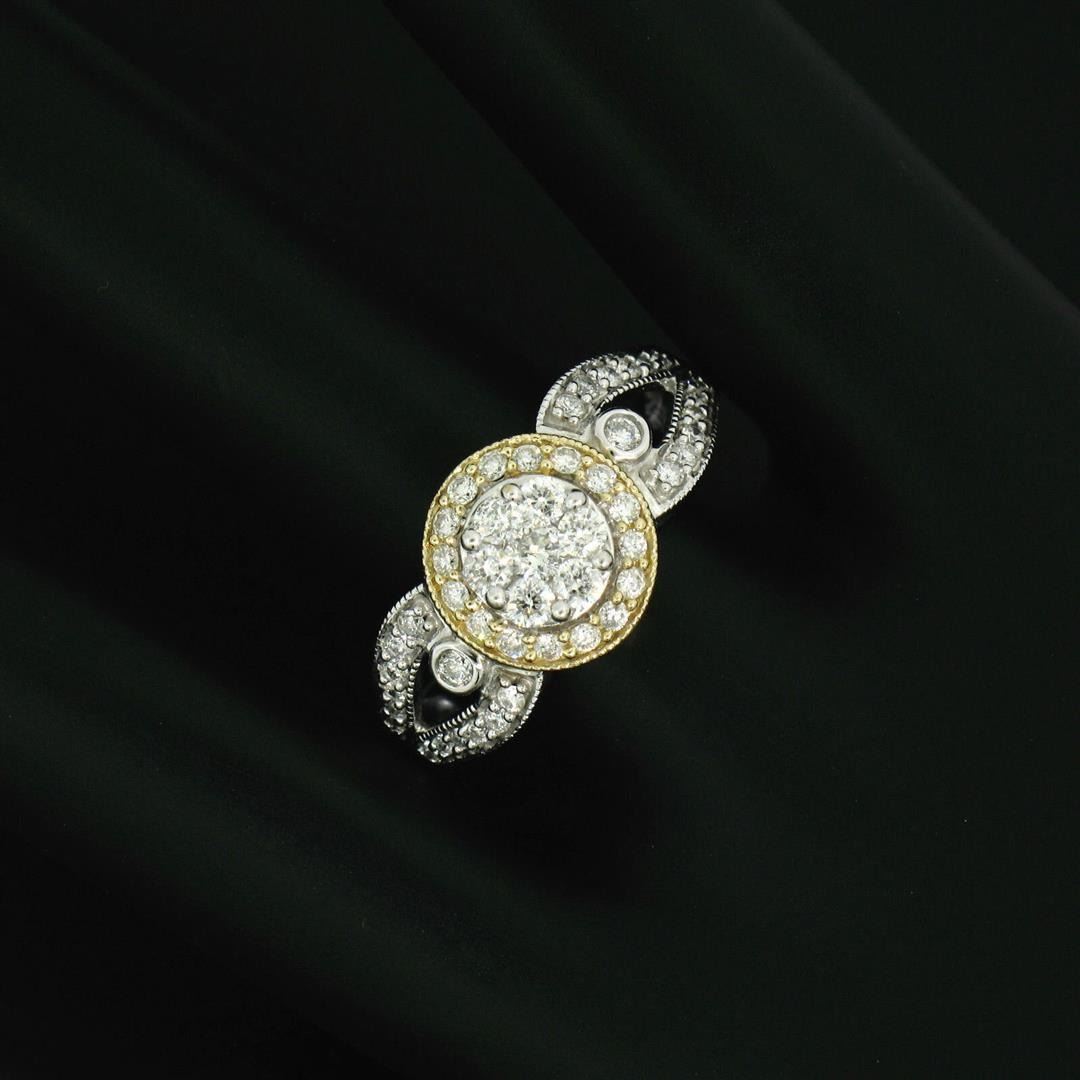 A new solid 14k yellow and white gold cluster ring, with 49 round brilliant cut natural diamonds (F/G- VS1; 0.75ctw). The ring is size 7.0, weighs a total of 4.60 grams, and measures 10.5mm wide.