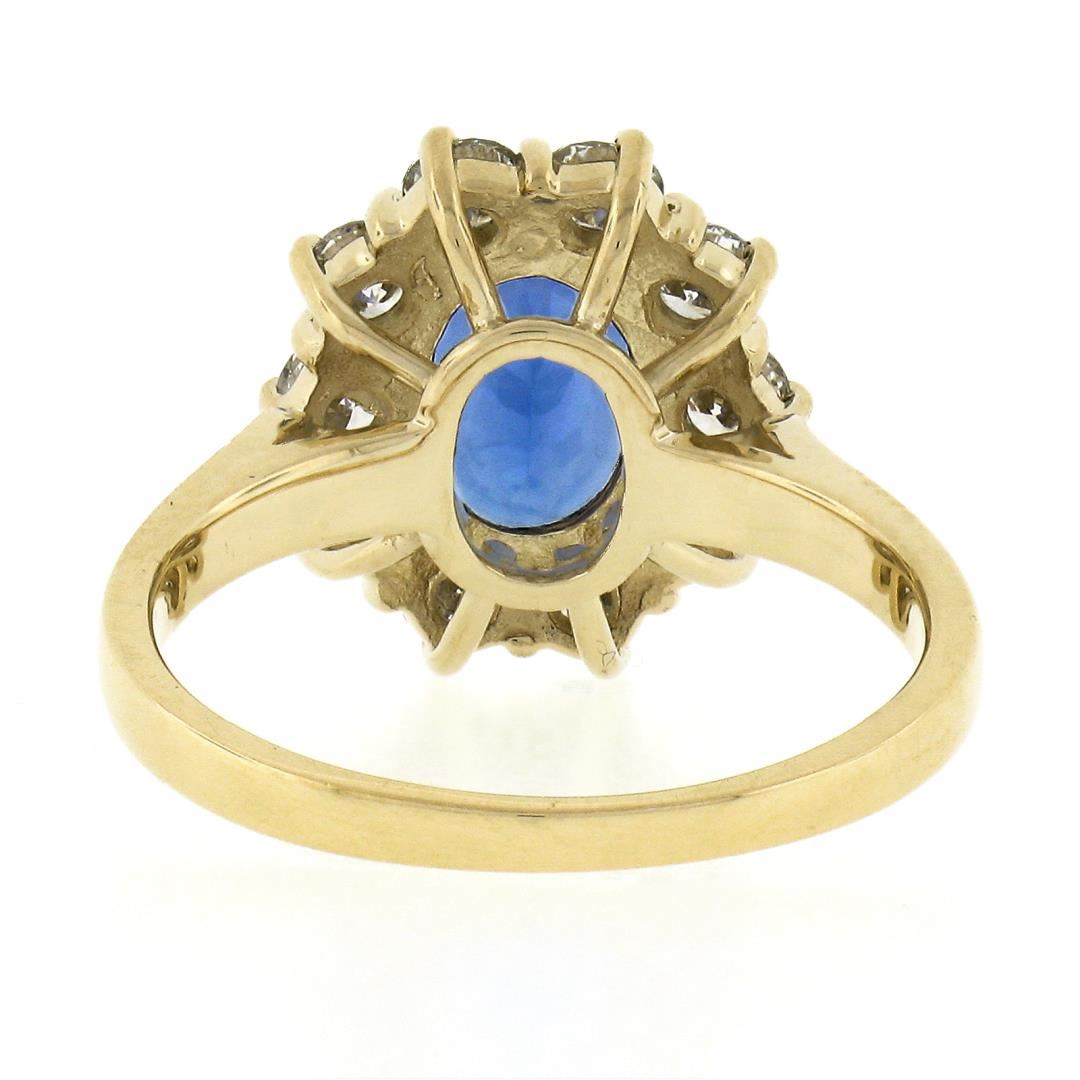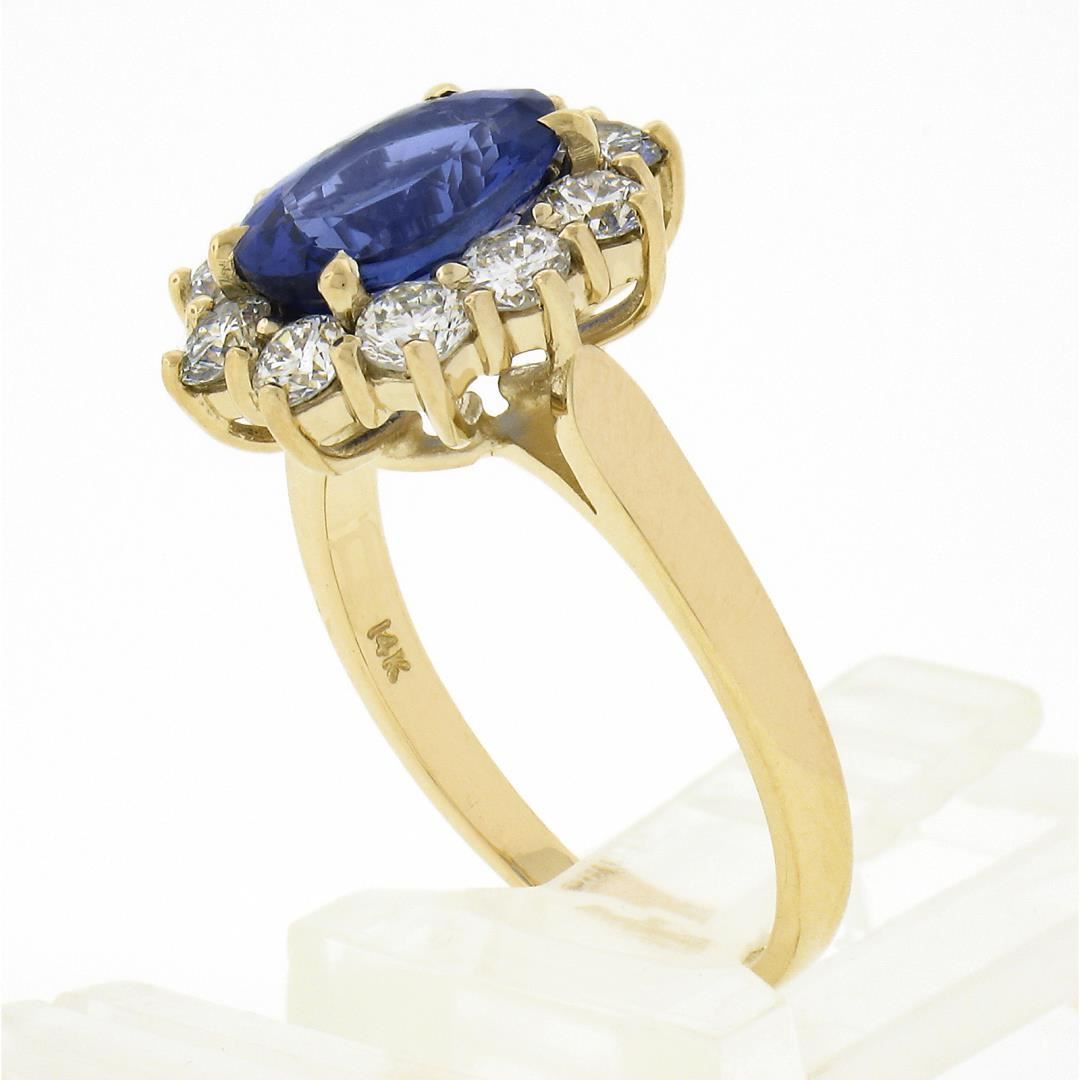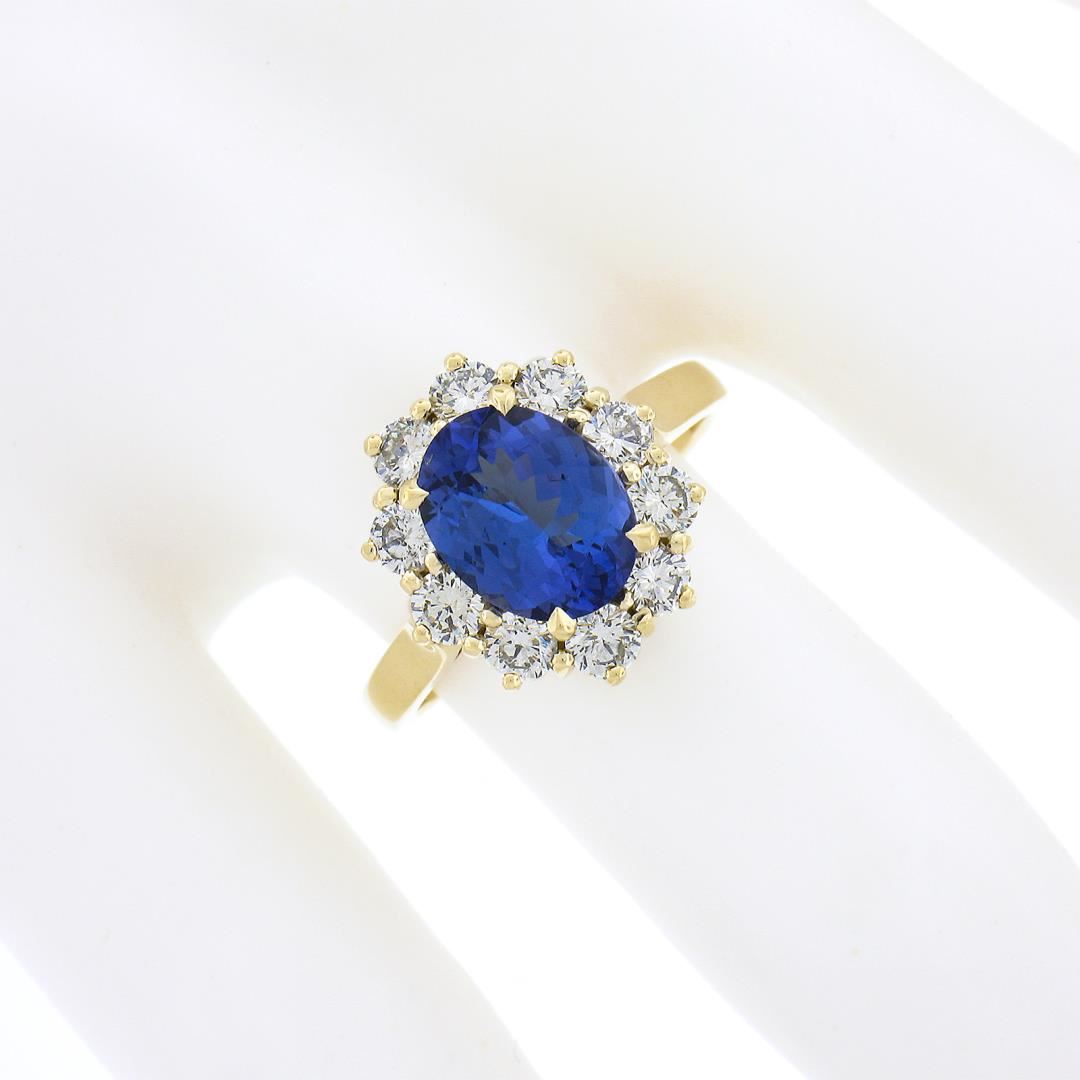 A new solid 14k yellow gold ring, with 1 oval cut natural tanzanite (9.1x7.1mm - 1.98ct ), and a halo of 10 round brilliant cut natural diamonds (G/H - VS2/SI1 ; 0.88ctw). The ring is size 6.0, weighs a total of 3.95 grams, and measures 13.50mm wide.