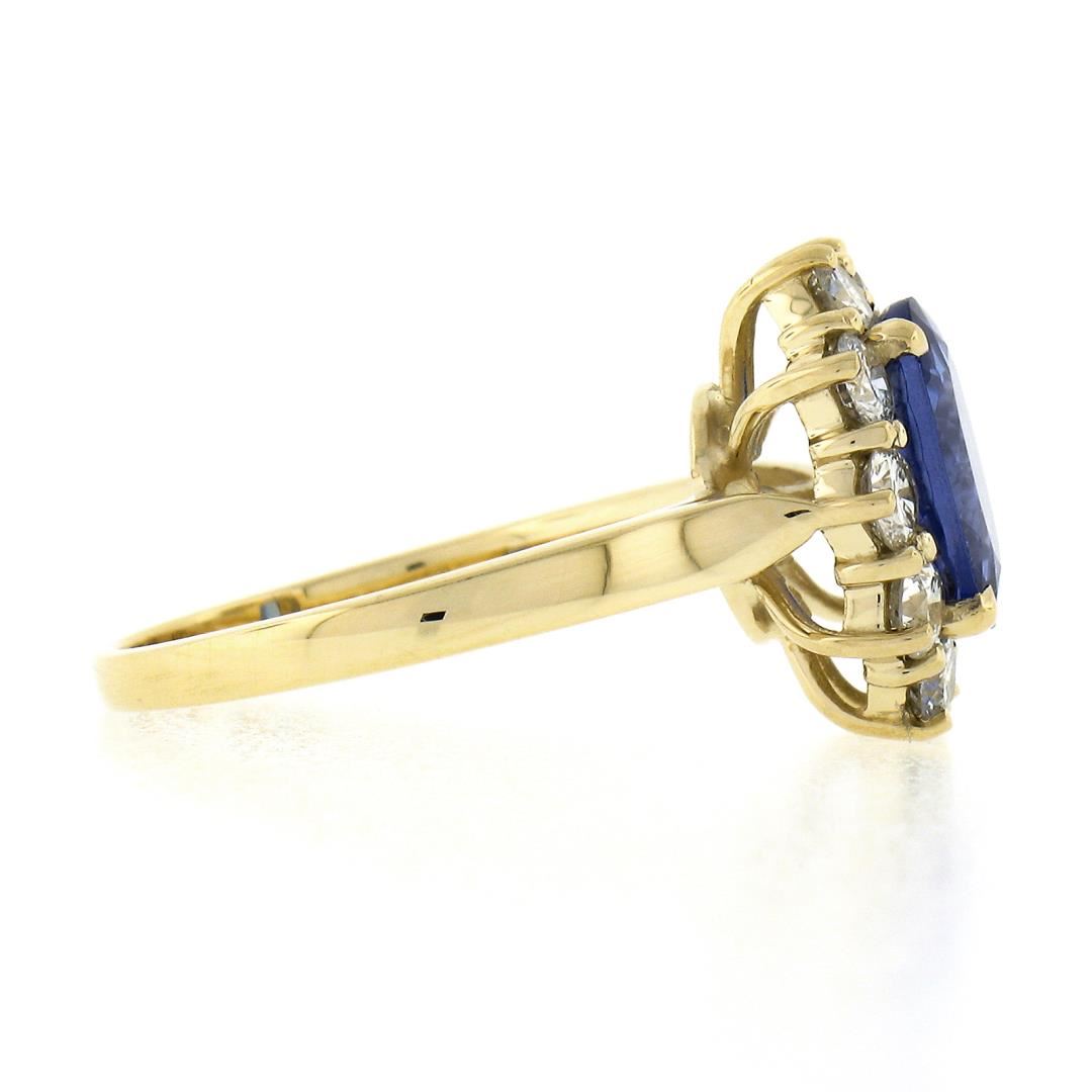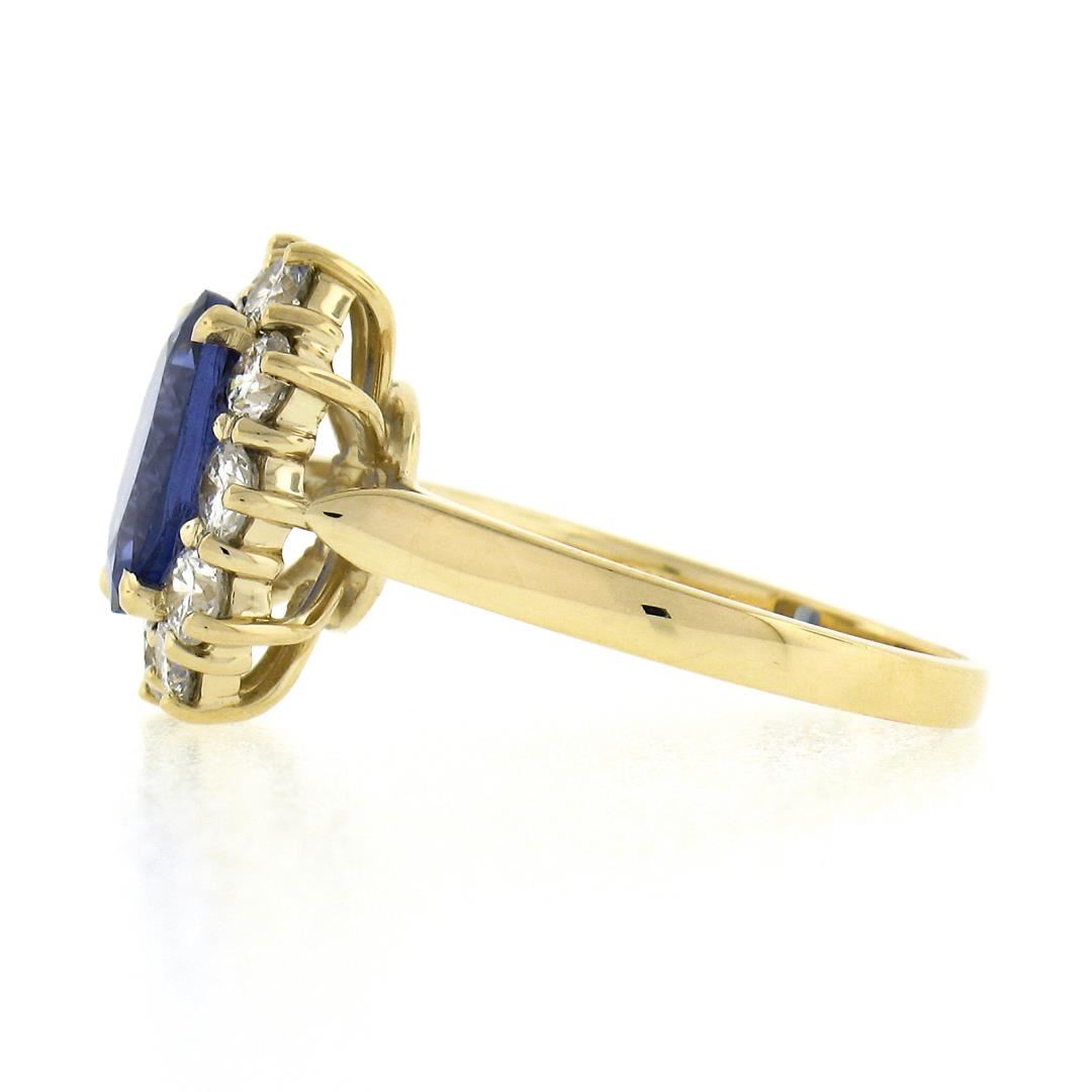 A new solid 14k yellow gold ring, with 1 oval cut natural tanzanite (9.1x7.1mm - 1.98ct ), and a halo of 10 round brilliant cut natural diamonds (G/H - VS2/SI1 ; 0.88ctw). The ring is size 6.0, weighs a total of 3.95 grams, and measures 13.50mm wide.