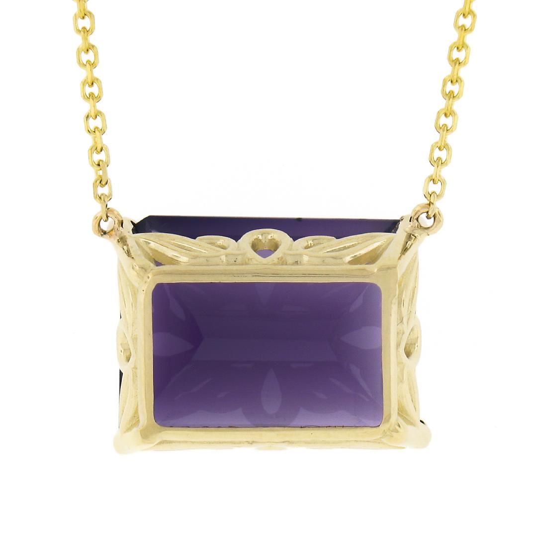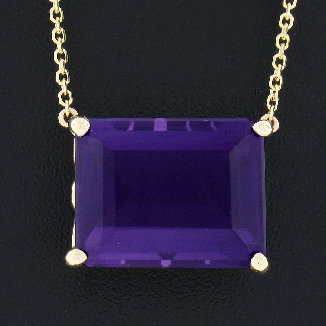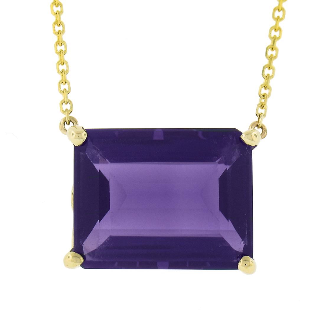 A new solid 14k yellow gold pendant necklace, with 1 emerald cut natural amethyst (14.6x11.4mm). 18.5 inch cable link chain, 5.10 grams total weight, pendant measures 11.8x15.9mm.