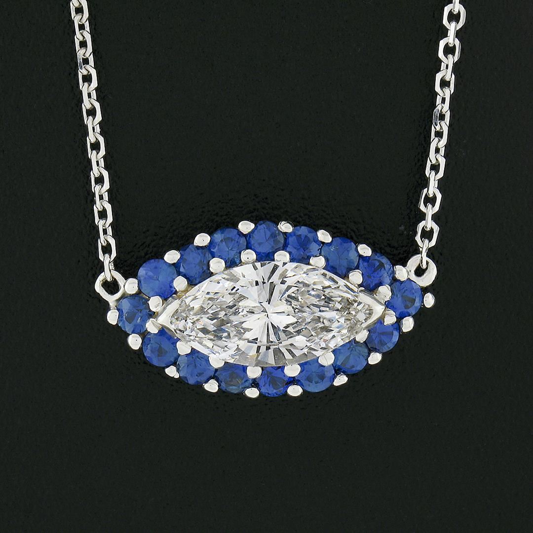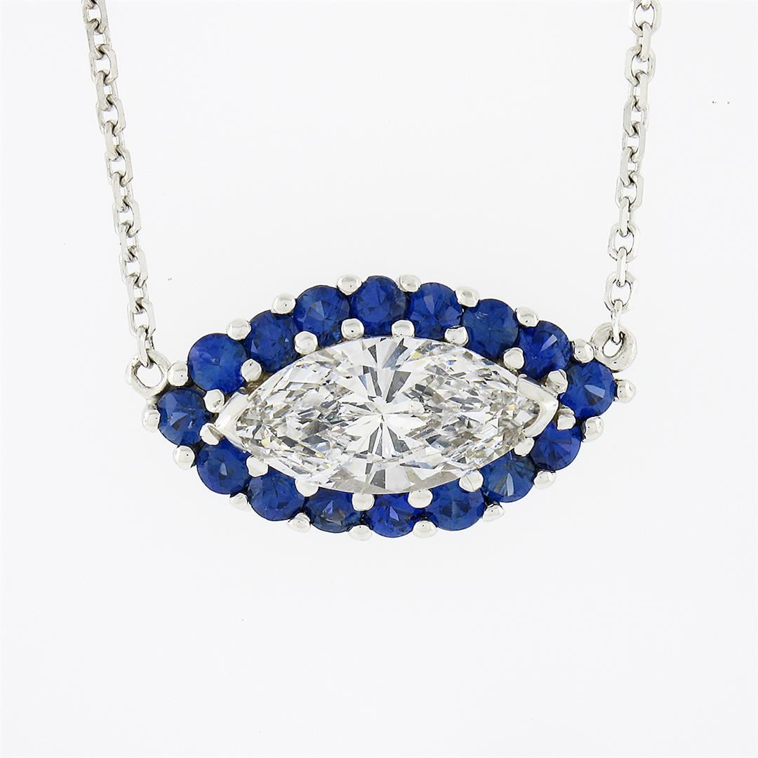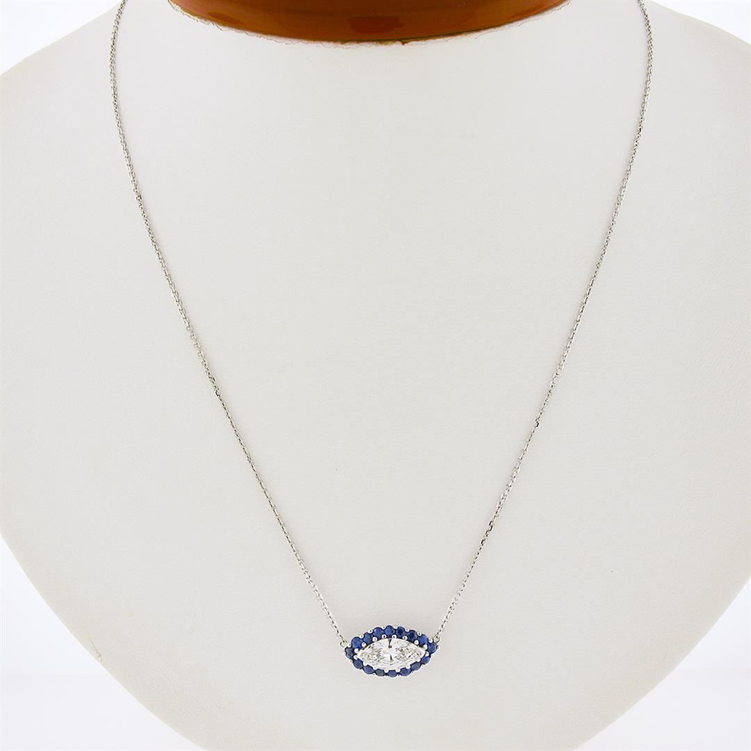 A news solid 18k white gold evil eye pendant necklace, with 1 gia certified marquise cut natural diamond (E - VS2 ; 0.88ct), and 16 round brilliant cut natural sapphires (0.68ctw). The pendant weighs a total of 3.81 grams, measures 8.85x16.40mm including the bail, and adjustable at 17 or 19 inch cable link chain. Comes with all original relevant certifications.