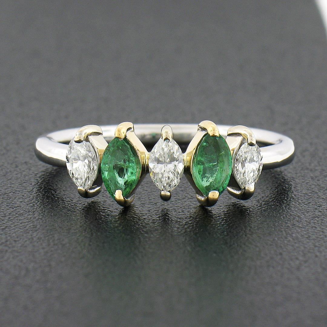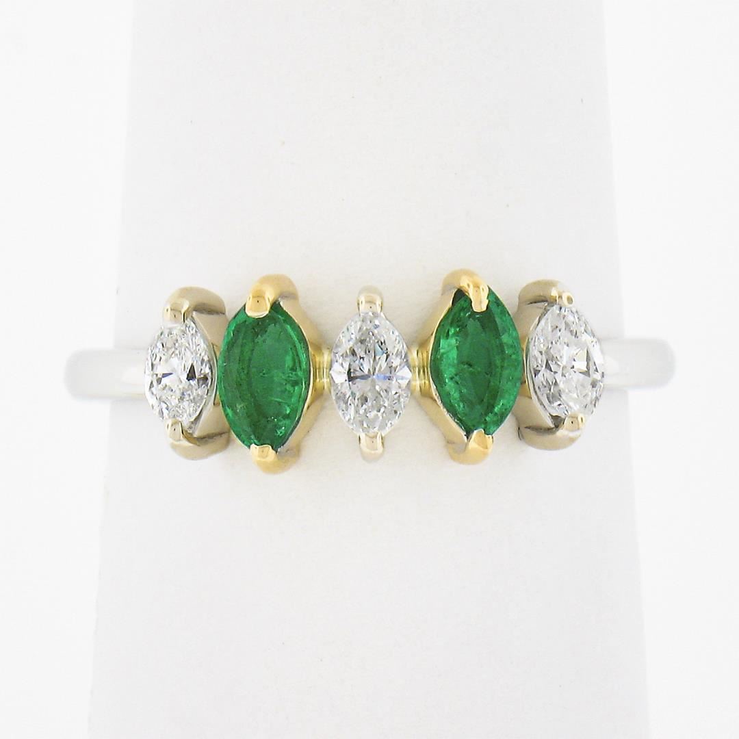 A new solid 18k two tone gold ring. with 2 marquise cut natural emeralds (0.33ctw), and 3 marquise cut natural diamonds (G/H - 0.33ctw ; 0.33ctw). The ring is size 6.5, weighs a total of 2.54 grams, and measures 6.30mm wide.