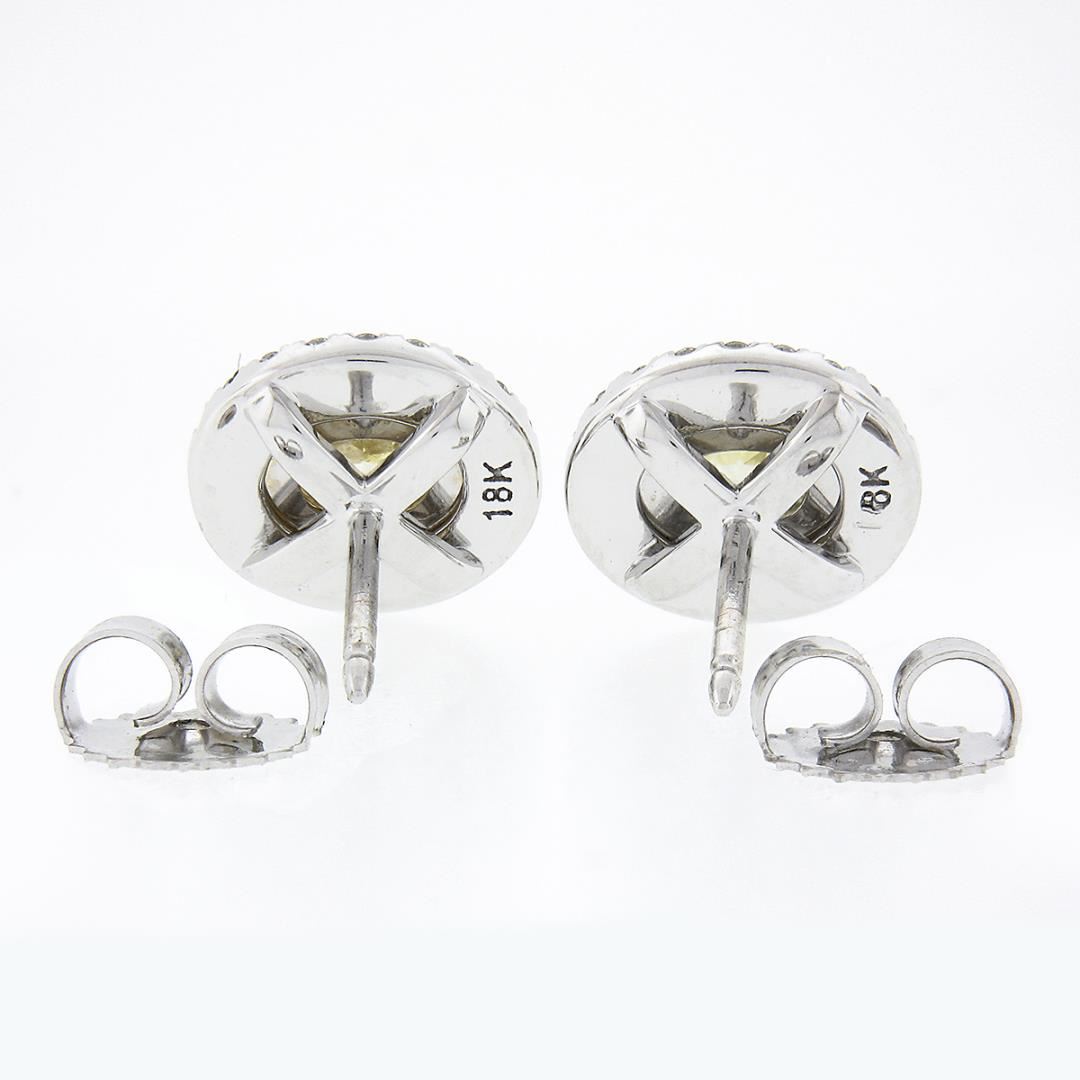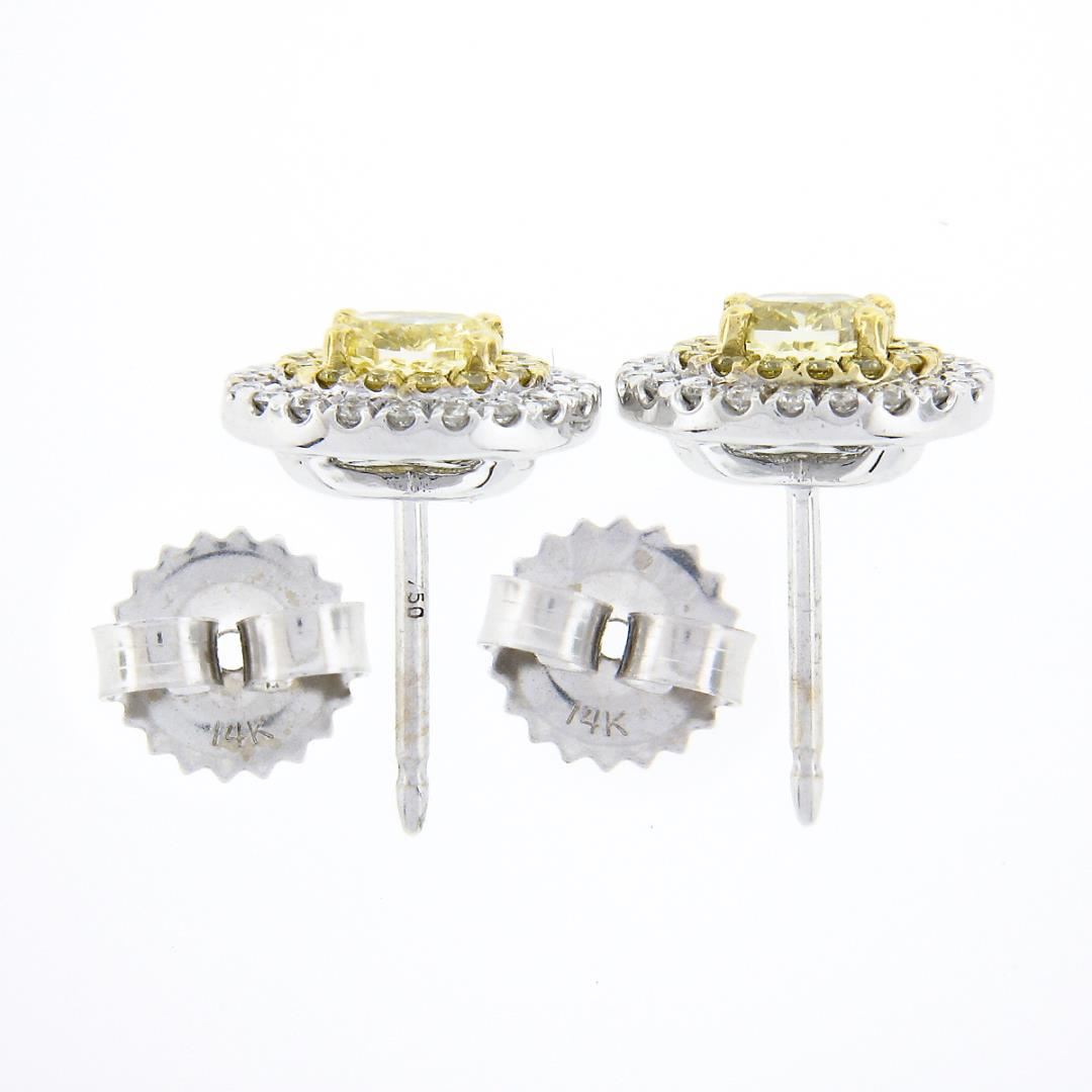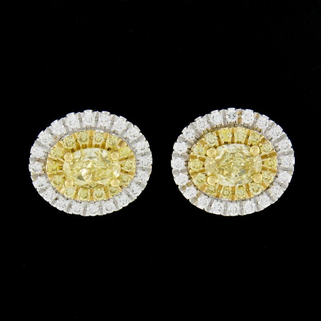 A new solid 18k yellow & white gold stud earrings, with 2 oval cut natural fancy yellow diamonds (VS1/VS2 ; 0.66ctw), 28 round cut natural fancy yellow diamonds (VS1/VS2 ; 0.14ctw), and 40 round cut natural diamonds (F/G - VS1/VS2 ; 0.20ctw). The earrings measure approximately 10.15x8.95mm and weigh a total of 3.74 grams.