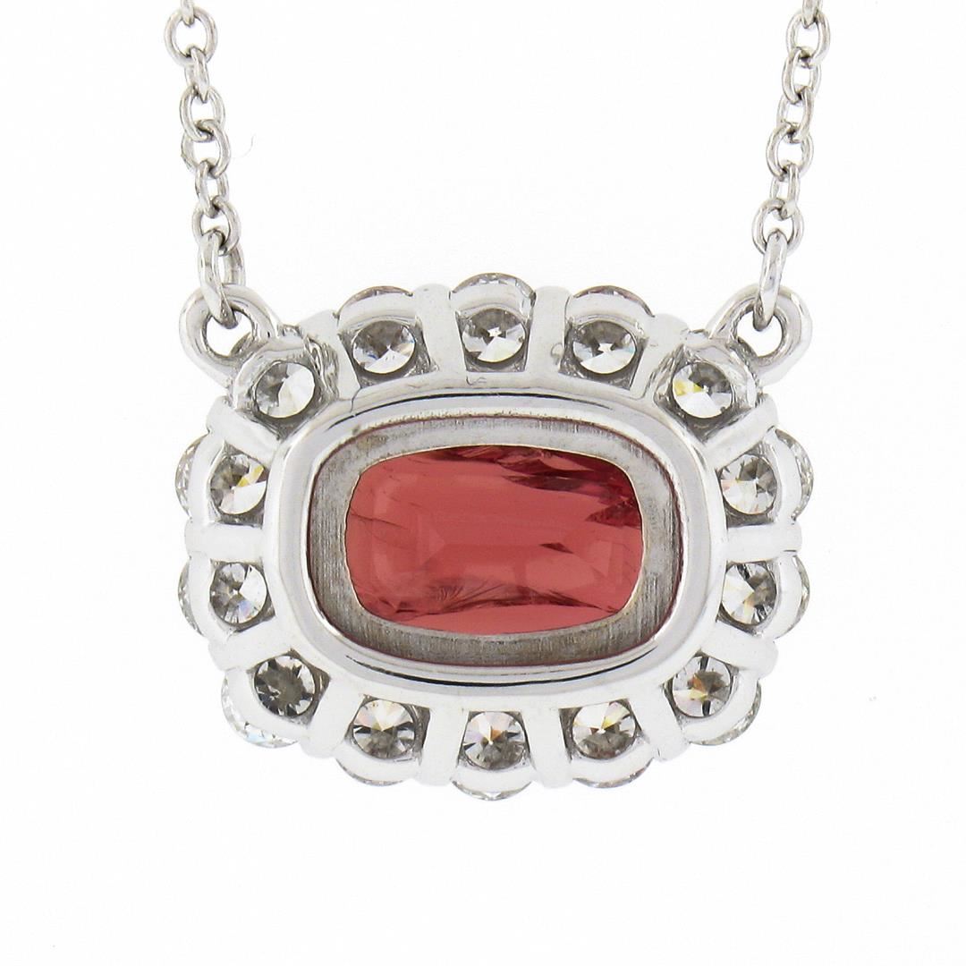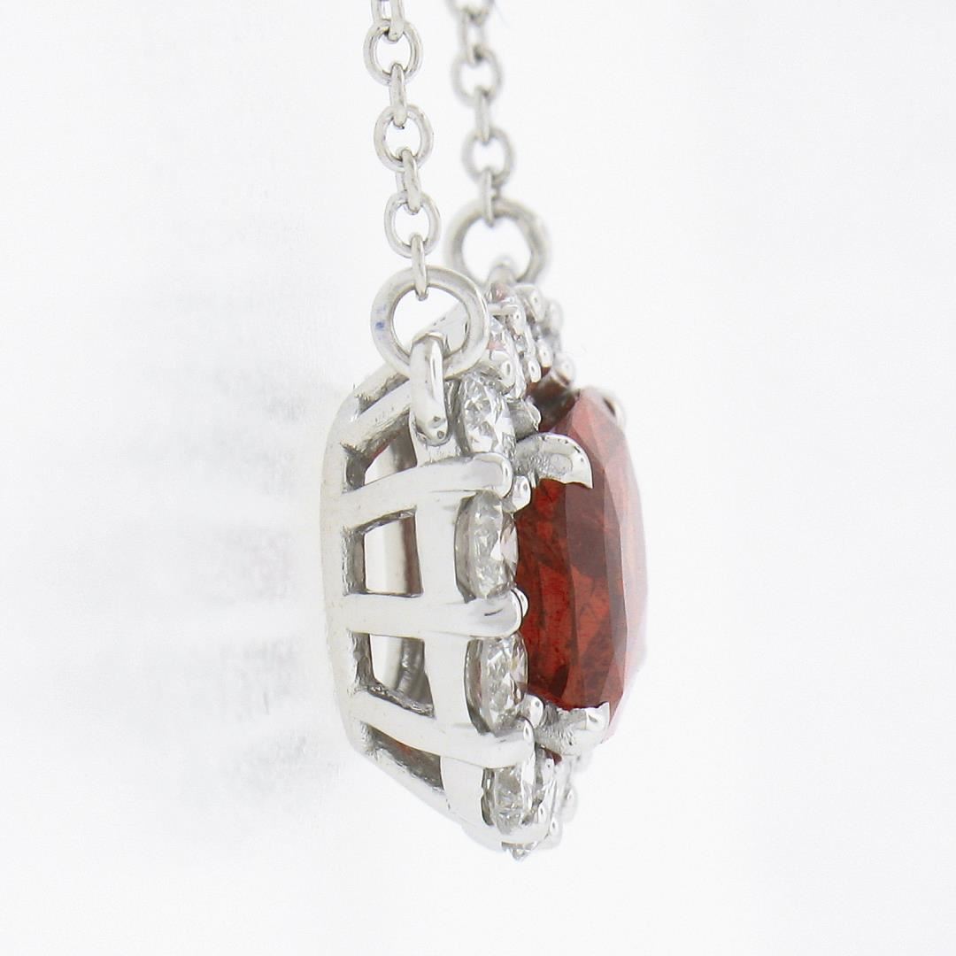 A new solid 18k white gold pendant necklace, featuring 1 GIA graded cushion cut natural spinel (2.69ct), surrounded with a halo of 14 round brilliant cut natural diamonds (G/H - VS1/VS2 ; 0.92ctw ). Adjustable at 16.5 or 18.5 inch cable link chain, 5.20 grams total weight, pendant measures 12.85x15.40mm. Comes with all original relevant certifications.