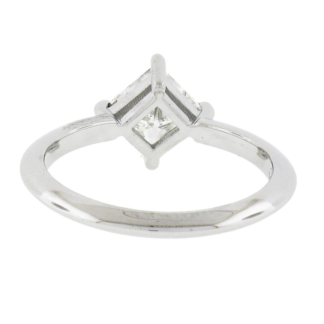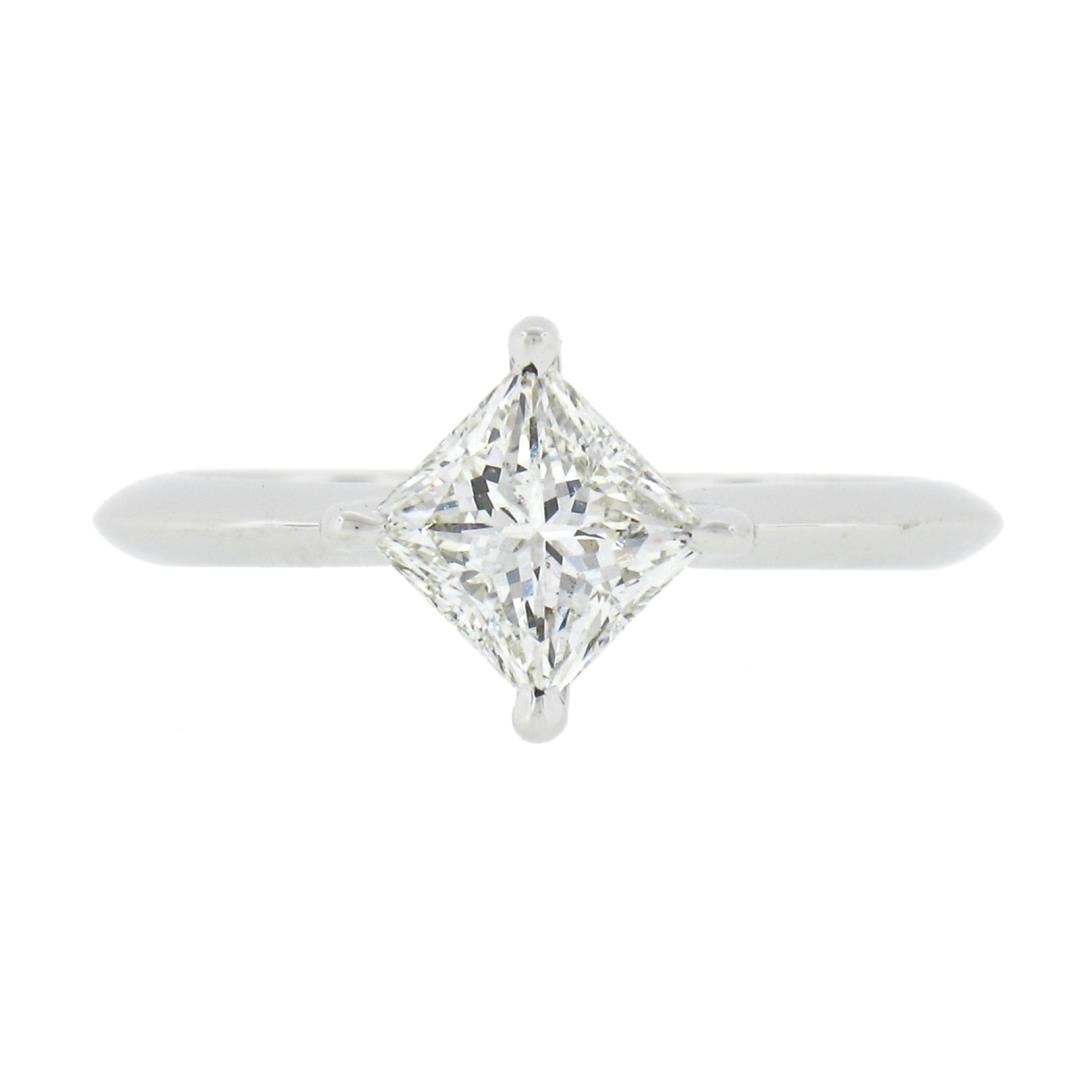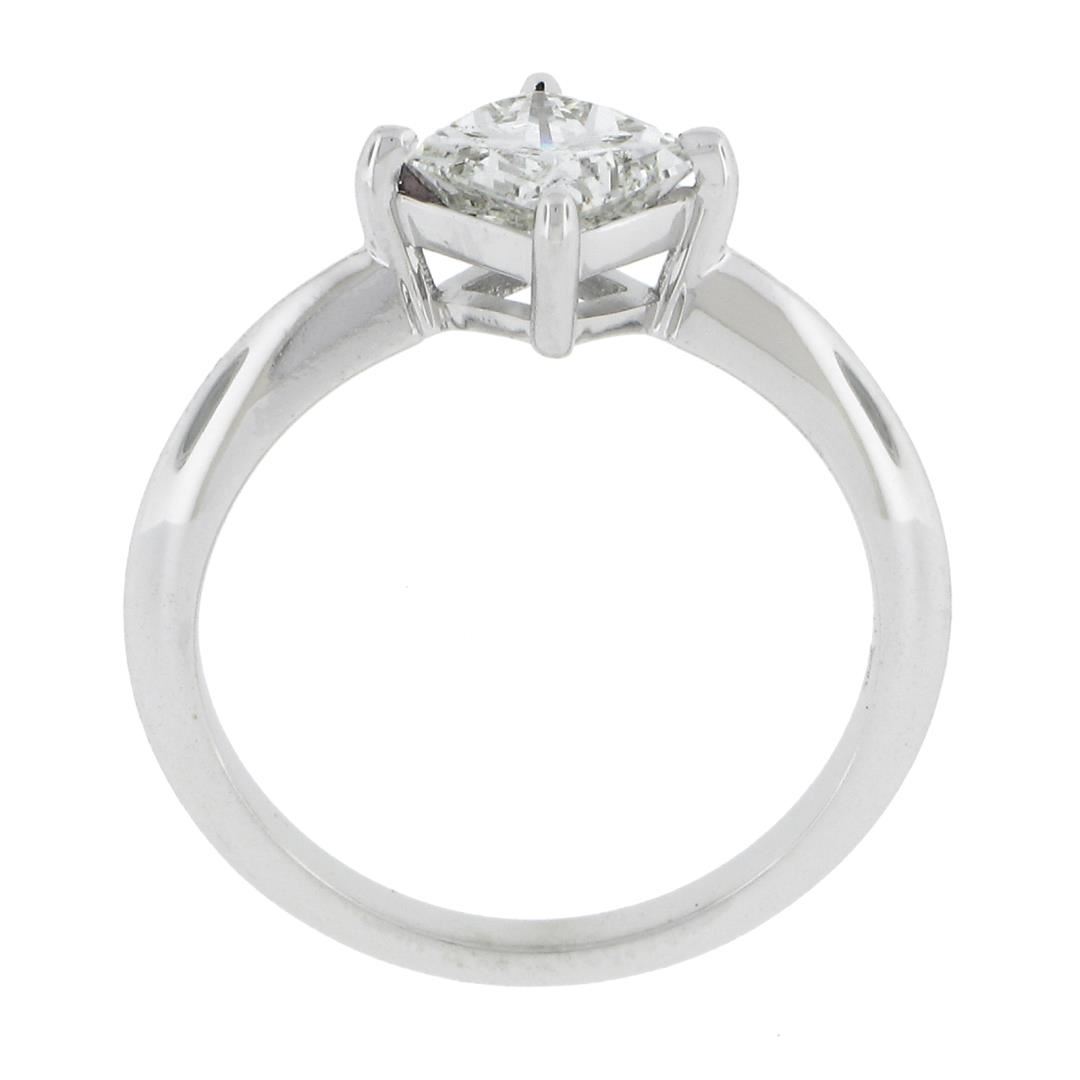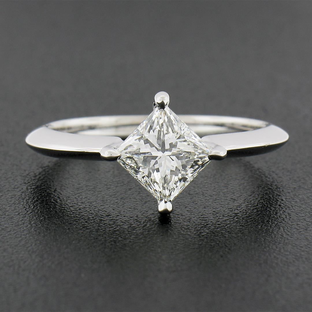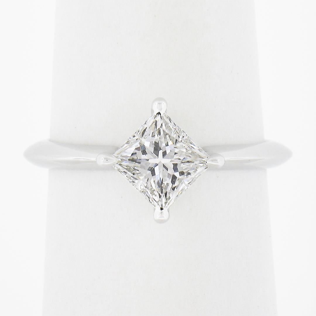 A new solid 18k white gold soliatire engagement ring, featuring 1 GIA graded princess cut natural diamond (I - SI1 ; 1.10ct). The ring is size 6.5, weighs a total of 3.12 grams, and measures 9.3mm wide. Comes with all original relevant certifications.