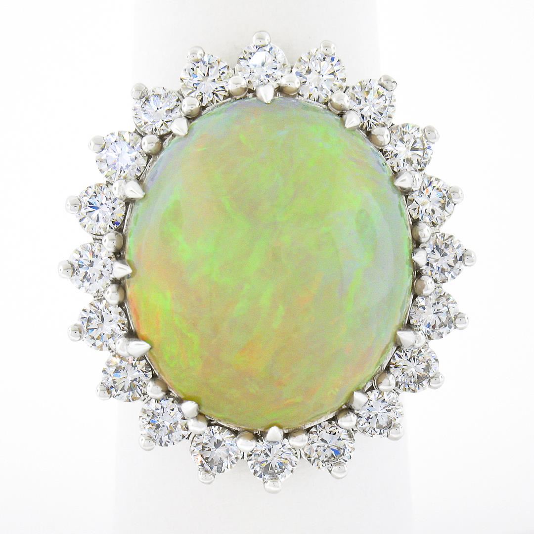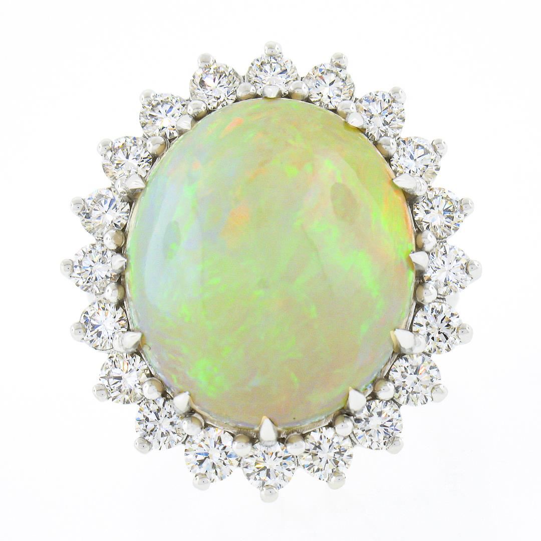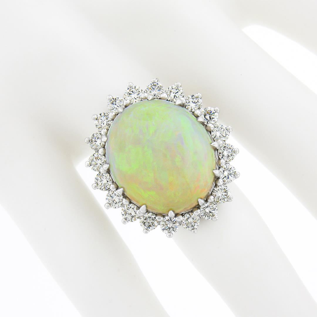 A new solid 18k white gold ring, with 1 GIA graded oval cabohcon cut natural opal (19.54x16.89x9.0mm / 15.47ct ), surrounded with a halo of 20 round brilliant cut natural diamonds (G/H - VS1/VS2 ; 2.14ctw). The ring is size 6.5, weighs a total of 13.58 grams, and measures 27.30mm wide. Comes with all original relevant certifications.