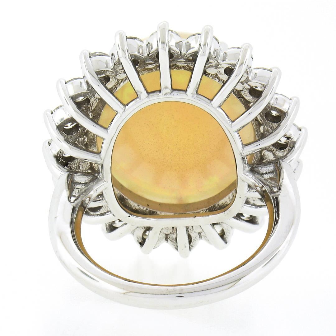 A new solid 18k white gold ring, with 1 GIA graded oval cabohcon cut natural opal (19.54x16.89x9.0mm / 15.47ct ), surrounded with a halo of 20 round brilliant cut natural diamonds (G/H - VS1/VS2 ; 2.14ctw). The ring is size 6.5, weighs a total of 13.58 grams, and measures 27.30mm wide. Comes with all original relevant certifications.