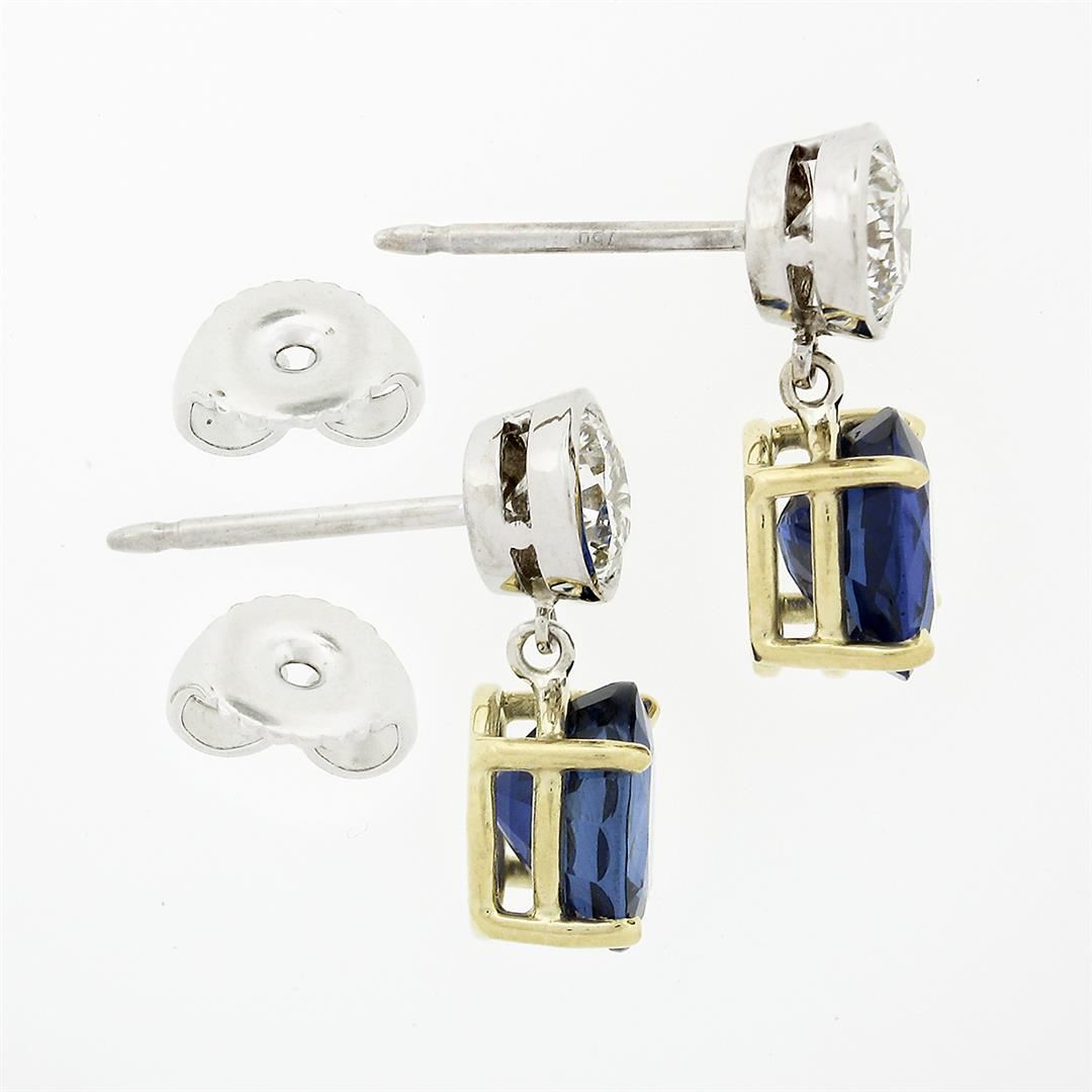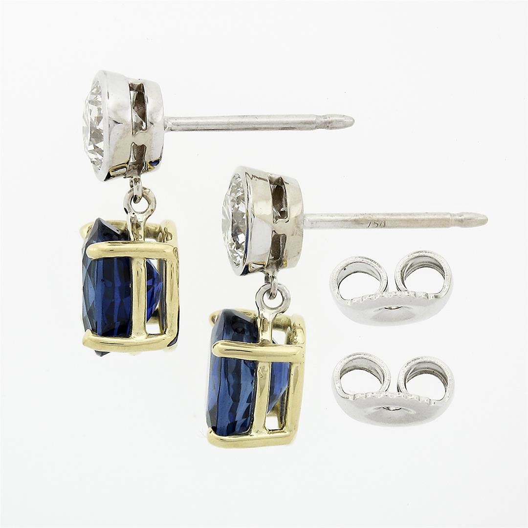 A new solod 18k yellow & white gold pair of drop dangle earrings, with 2 Gia ceritifed oval brilliant cut natural sapphires (3.80ctw), & 2 Gia certified round brilliant cut natural diamonds (H- SI1/SI2; 1.18ctw). The earrings measure approximately 16.7x6.1mm and weigh a total of 3.58 grams. Comes with all original relevant certifications.