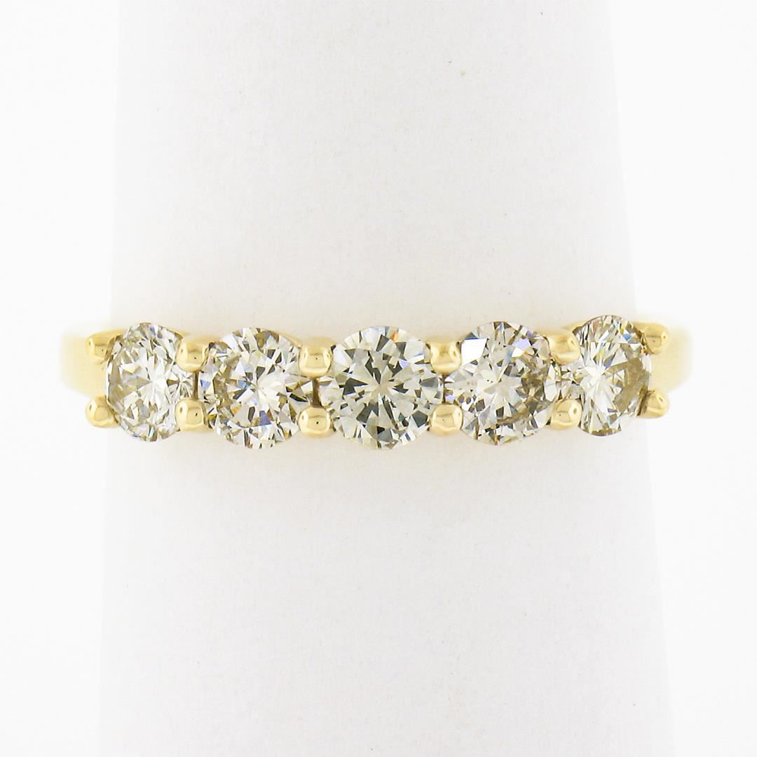 a new solid 18k yellow gold band ring, with 5 round cut natural diamonds (K-L / Light Brown - SI1-SI2 ; 0.92ctw). The ring is size 6.5, weighs a total of 2.75 grams, and measures 3.8mm wide.
