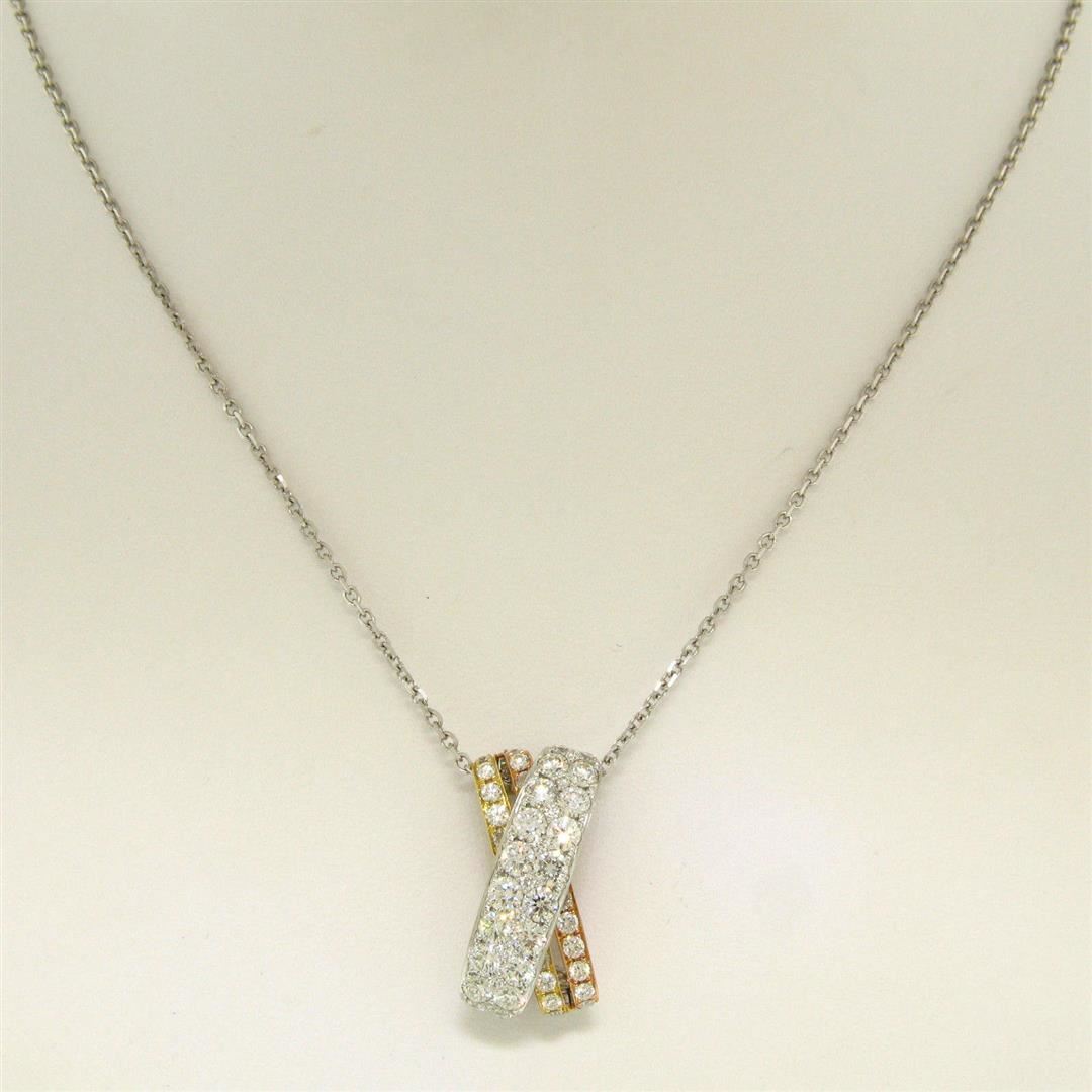 One NEW 18k Tri-Color Gold X Pendant w/ 2.18ctw F VS Pave Round Brilliant Diamonds. Item Details: Material: 18k Solid Gold (Chain is 14k), Weight: 6.3 Grams, Stone(s): (20) Natural Genuine Diamonds - Round Brilliant Cut - Pavé Set - VS2 Clarity - F Color - 2.4mm (avg.), (26) Natural Genuine Diamonds - Round Brilliant Cut - Pavé Set - VS2 Clarity - F Color - 2.0mm (approx.), (9) Natural Genuine Diamonds - Round Brilliant Cut - Pavé Set - VS2 Clarity - F Color - 1.0mm (approx.), Total Carat Weight: 2.18, Chain Type: Diamond Cut Cable Link, Chain Length: 18 Inches Clasp: Lobster Claw Width: 11.02mm Height: 22.51mm Thickness: 8.69mm Condition: New w/o Tag