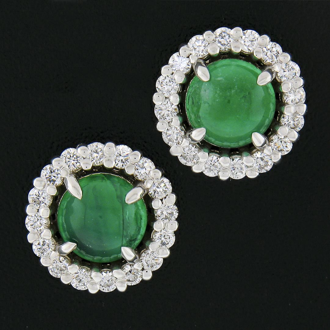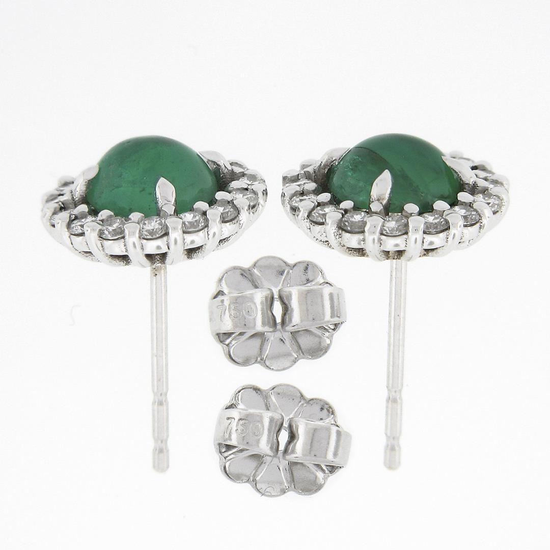 A new solid 18k white gold pair of stud earrings, with 2 round cabochon cut natural emeralds (1.30ctw), and a halo of 32 round brilliant cut natural diamonds (E/F - VS1/VS2 ; 0.42ctw). The earrings measure approximately 10.20mm in diameter and weigh a total of 3.0 grams.