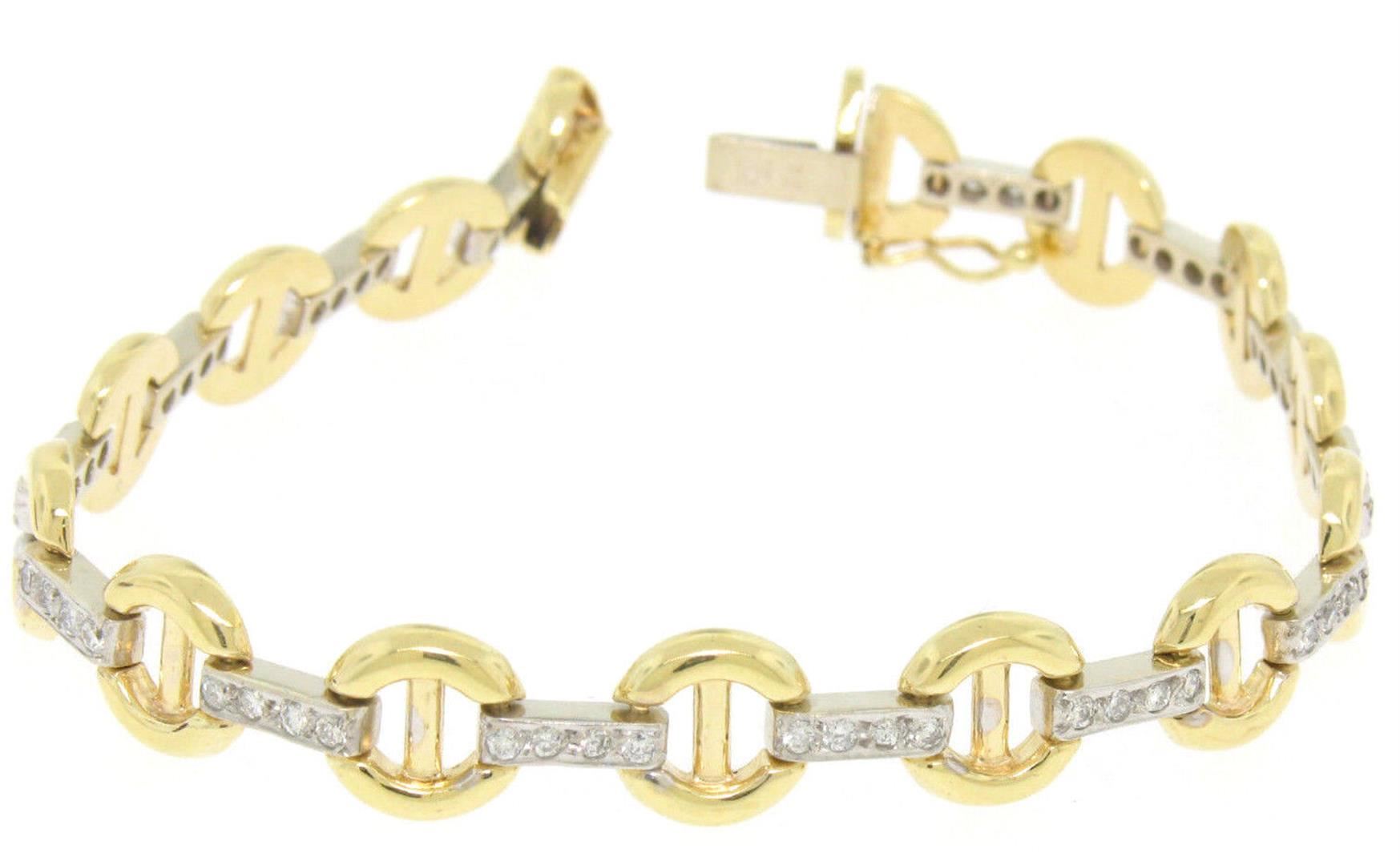 A new solid 14k yewllo and white gold bar link braceelt, featuring 56 round brilliant cut natural diamonds (G- VS2; 0.70ctw). It weighs a total of 12.3 grams, measures 8.94mm wide, and measures 7 inches in length.