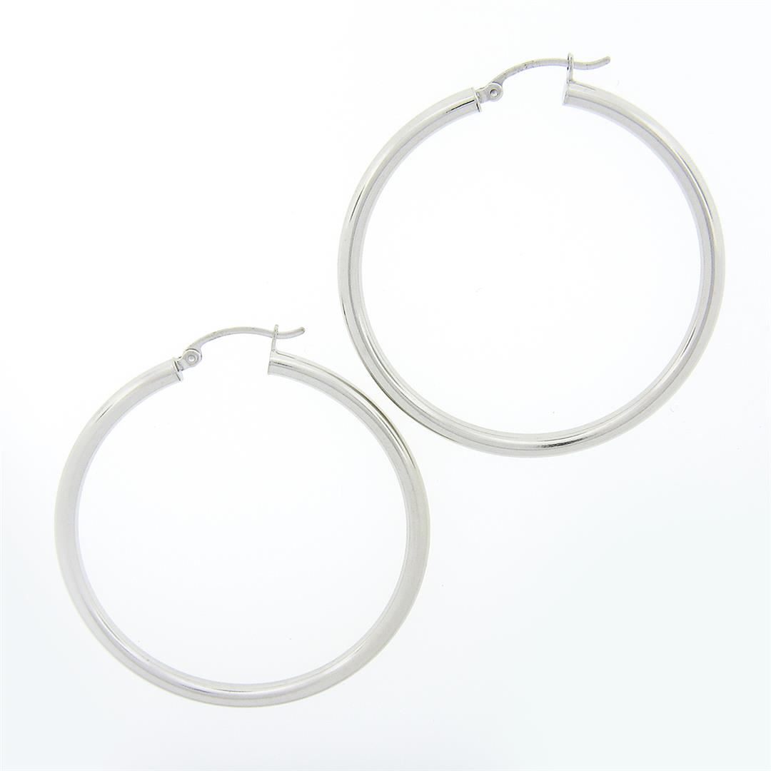 A solid 14k white gold pair of hoop earrings. The earrings measure approximately 45mm in diameter and weigh a total of 3.43 grams.