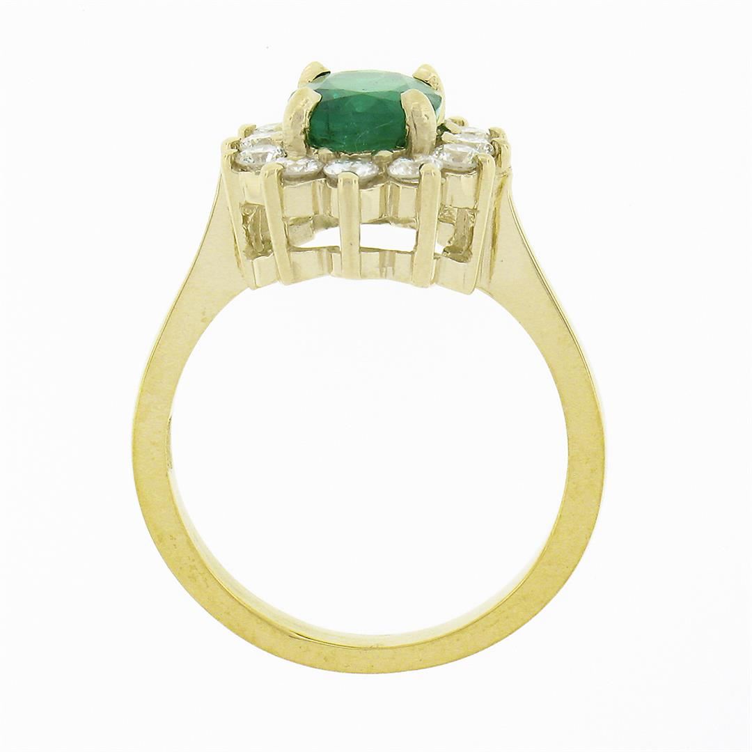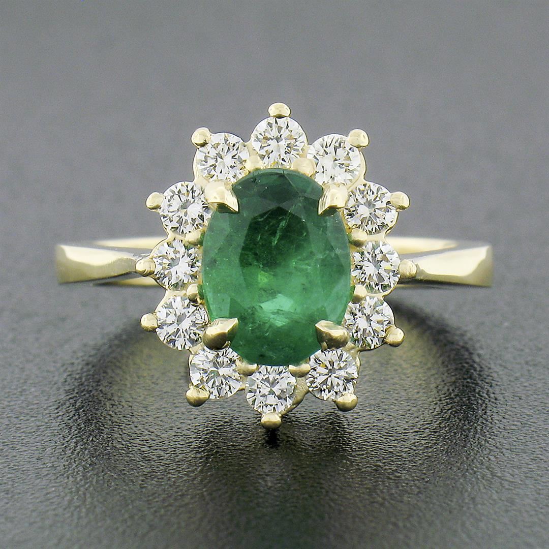 A new solid 14k yellow gold ring, with 1 oval cut natural emerald (1.45ct), surrounded with a halo of 12 round brilliant cut natural diamonds (G/H - VS1/VS2 ; 0.57ctw). The ring is size 6.0, weighs a total of 4.77 grams, and measures 14.10mm wide.