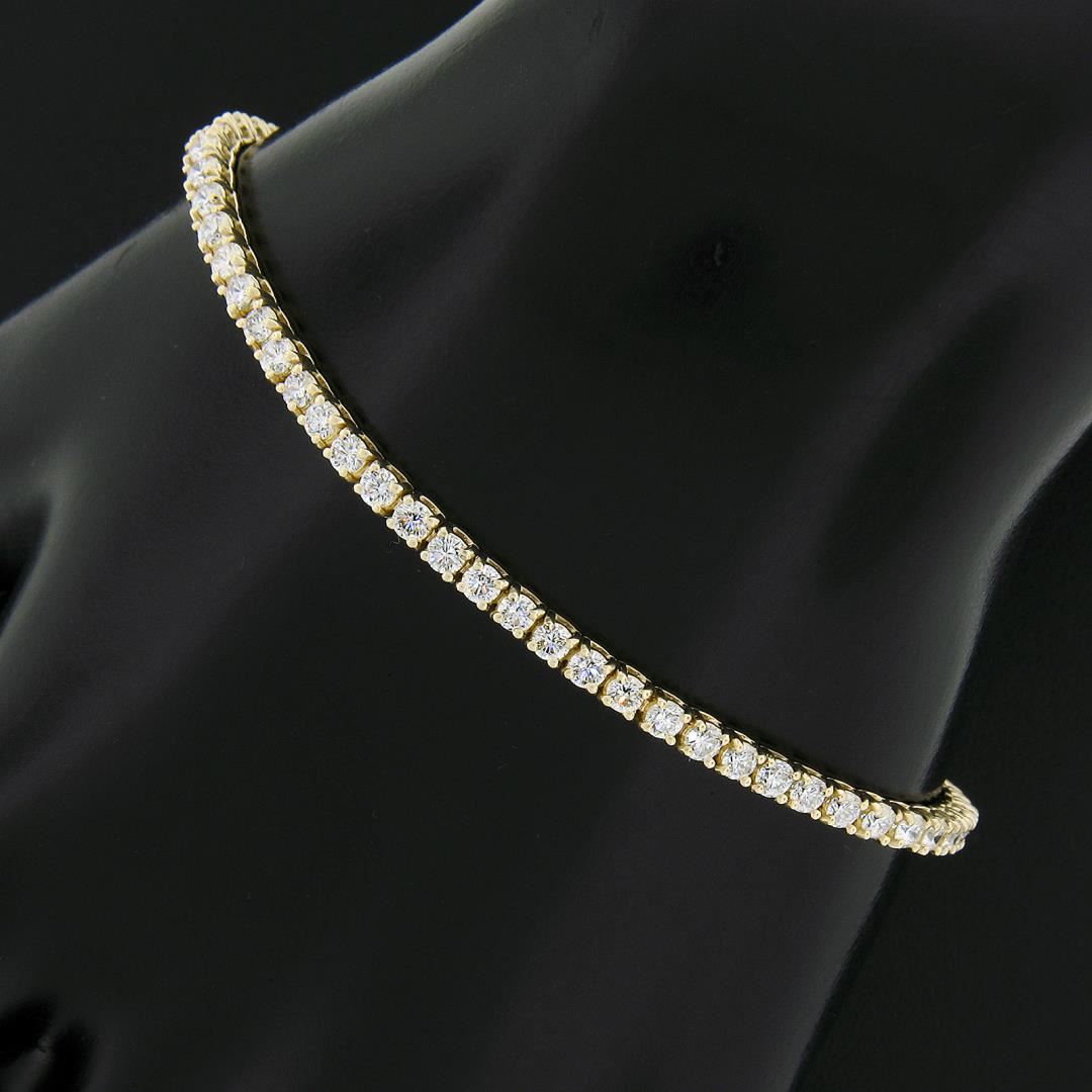 A new solid 14k yellow gold tennis bracelet, with 68 round brilliant cut natural diamonds (E/F- VVS2/VS1 ; 3.23ctw). It weighs a total of 7.64 grams, measures 2.6mm wide, and measures 6.75 inches in length.
