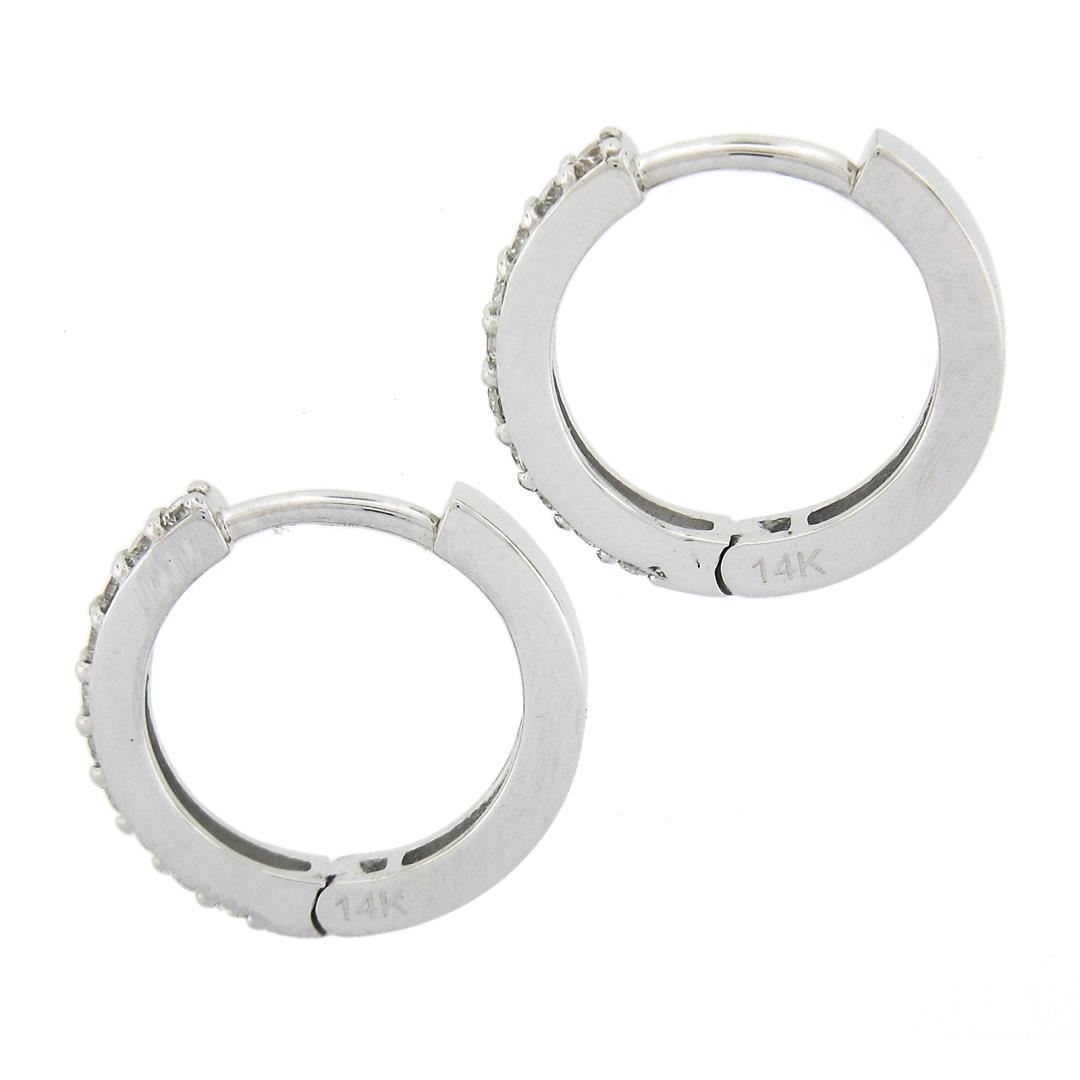 A new solid 14k white gold hoop earrings, with 20 round brilliant cut natural diamonds (G/H - VS1/VS2 ; 0.20ctw). The earrings measure approximately 12.2x2.1mm and weigh a total of 1.71 grams.