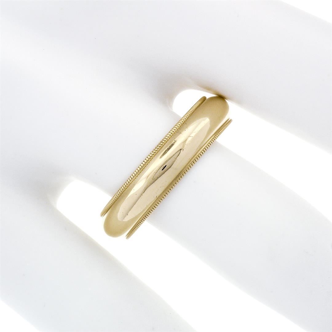 A new solid 14k yellow gold milgrain plain band ring. The ring is size 9.5, weighs a total of 5.79 grams, and measures 5.02mm wide.