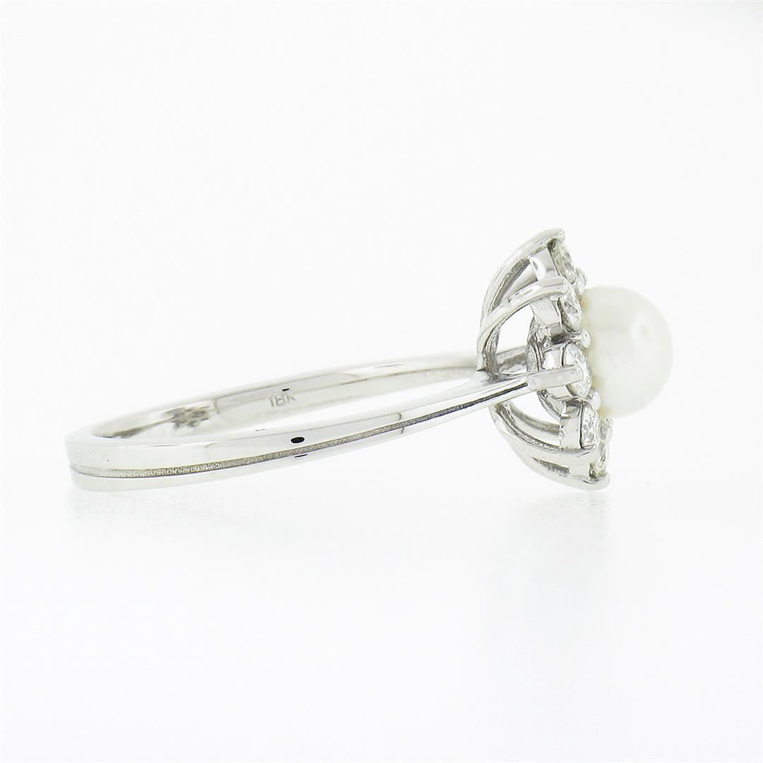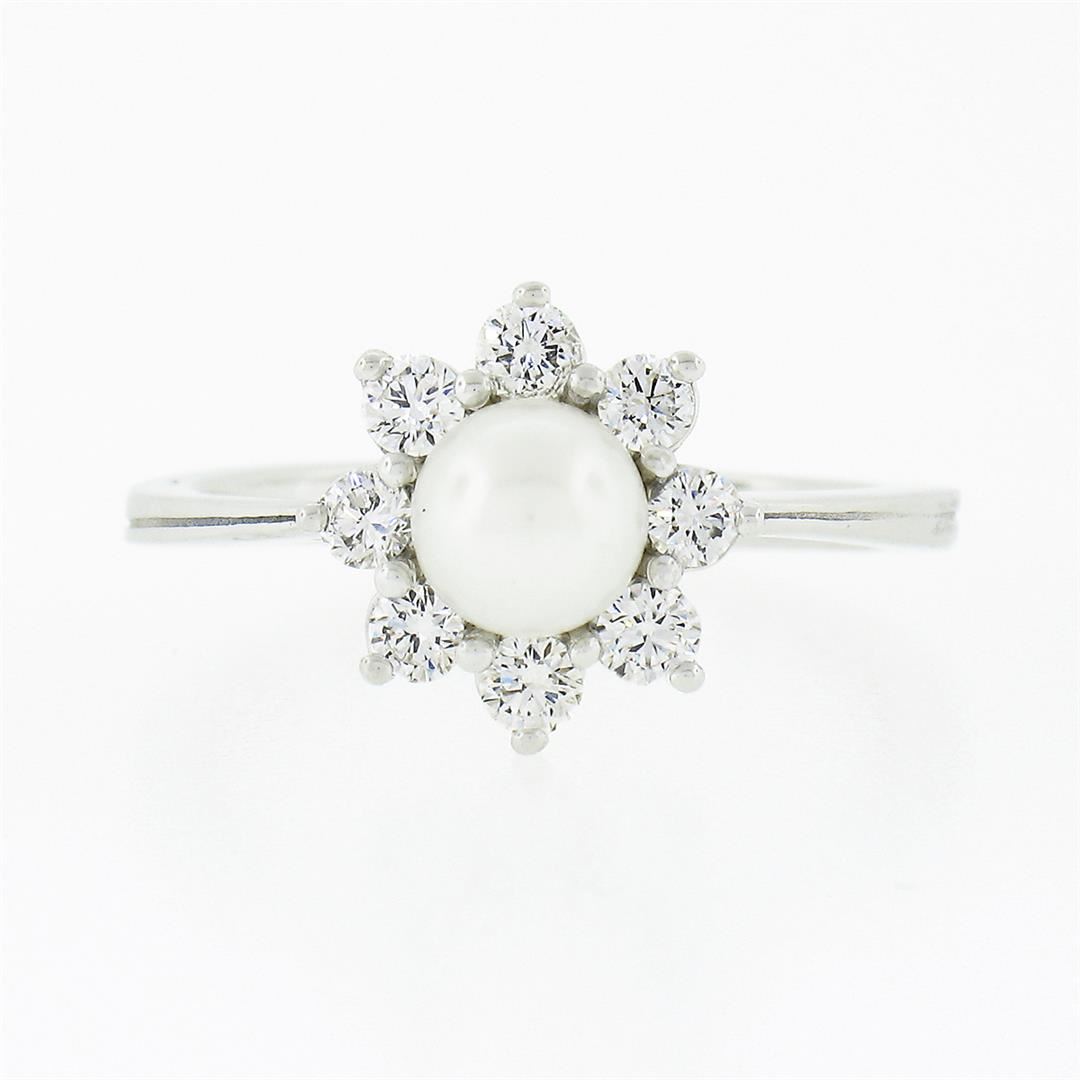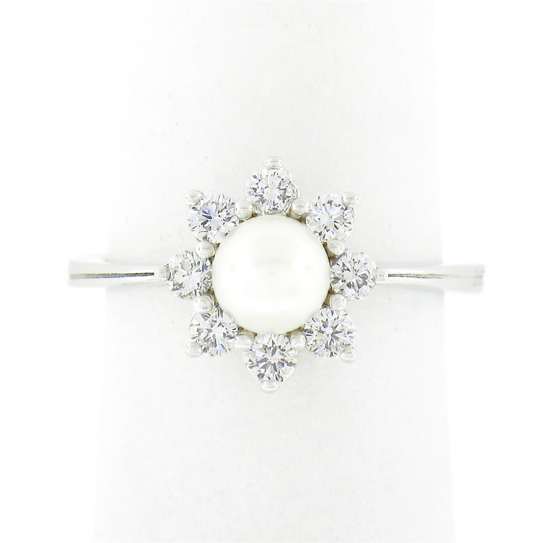 A new solid 18k white gold ring, with 1 round shape cultured pearl (5.25mm), surrounded with 8 round brilliant cut natural diamonds (G/H - VS1/VS2 ; 0.40ctw). The ring is size 5.0, weighs a total of 3.3 grams, and measures 10.60mm wide.