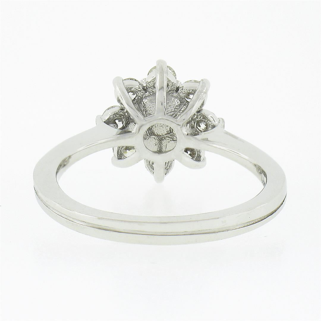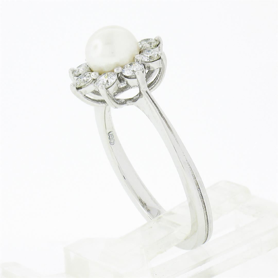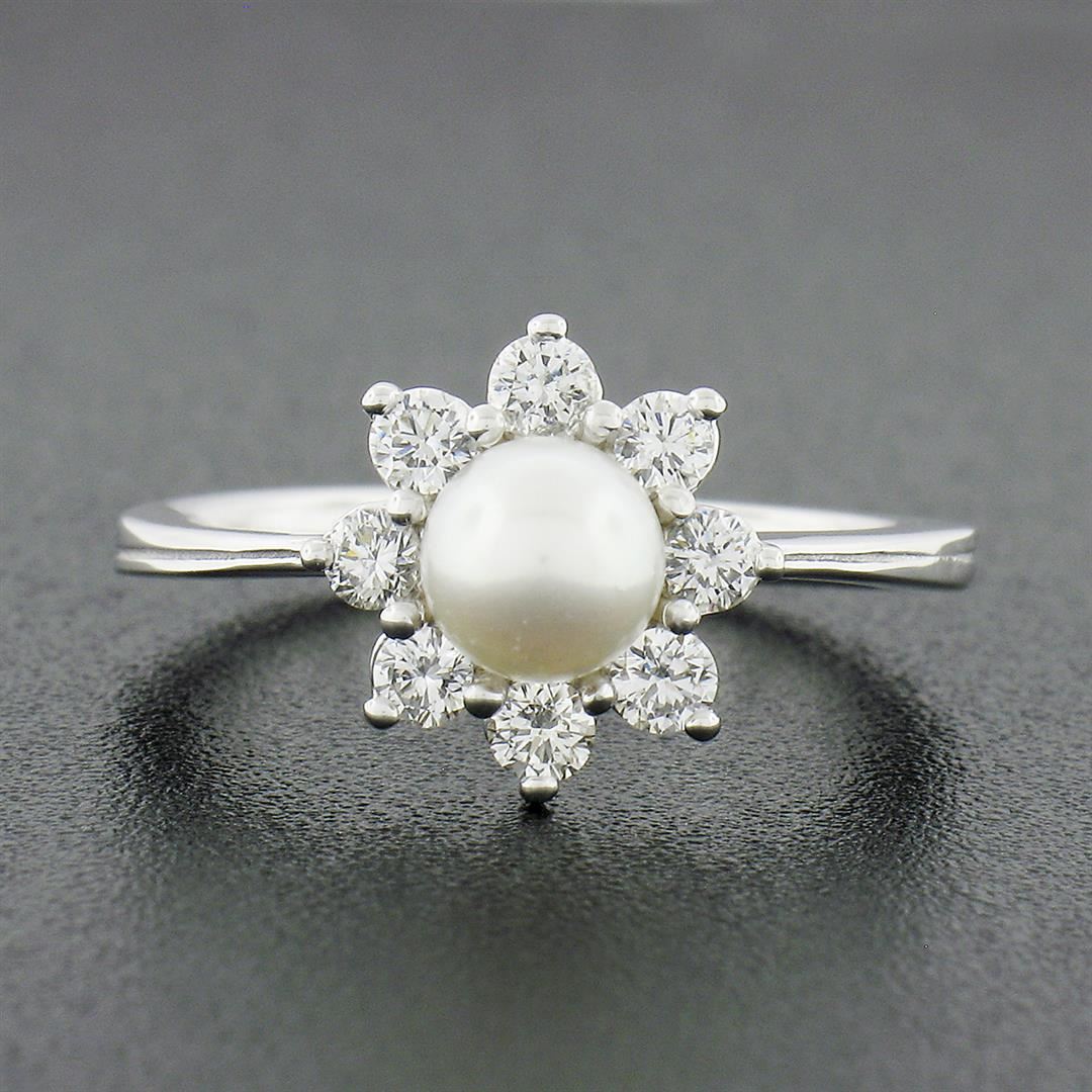 A new solid 18k white gold ring, with 1 round shape cultured pearl (5.25mm), surrounded with 8 round brilliant cut natural diamonds (G/H - VS1/VS2 ; 0.40ctw). The ring is size 5.0, weighs a total of 3.3 grams, and measures 10.60mm wide.
