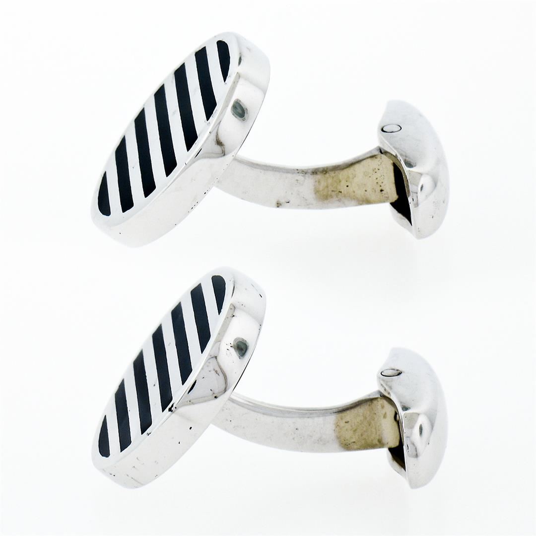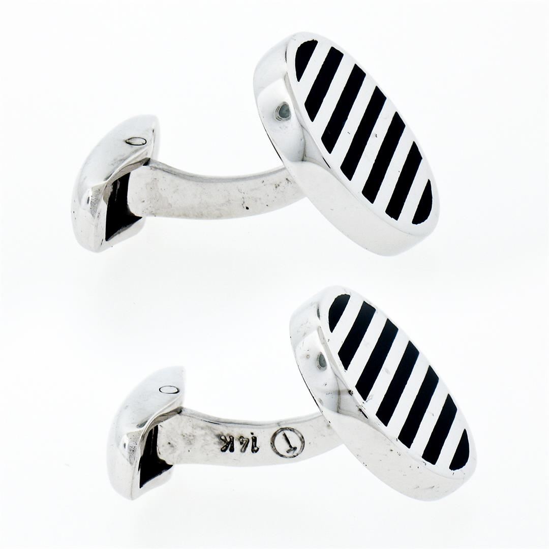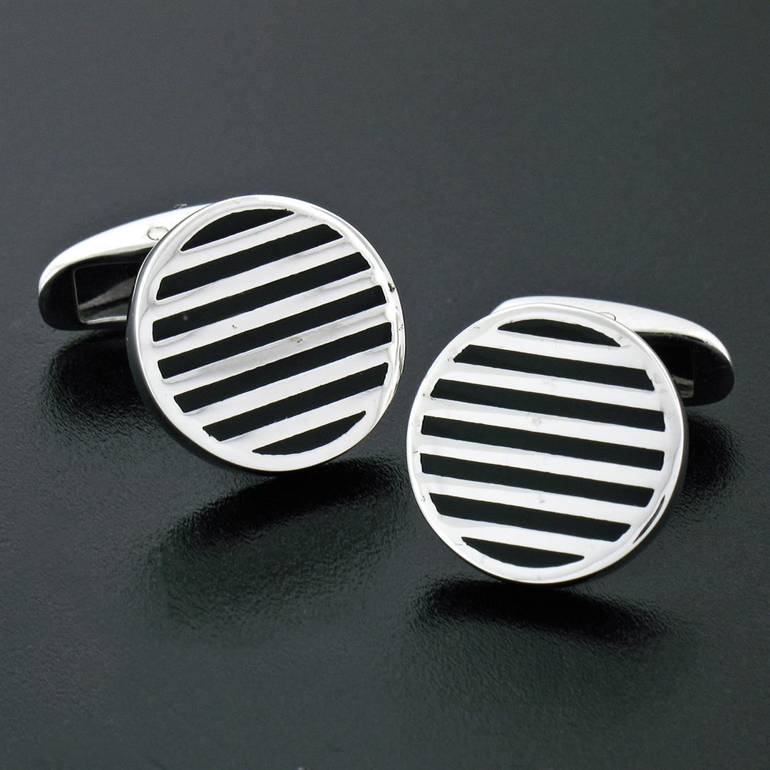 A new solid 14k white gold ribbed cufflinks. These cuff links have a swivel design with a clearance of 13.0mm, weigh a total of 9.50 grams, and the front panels measure 15.50mm in diameter.