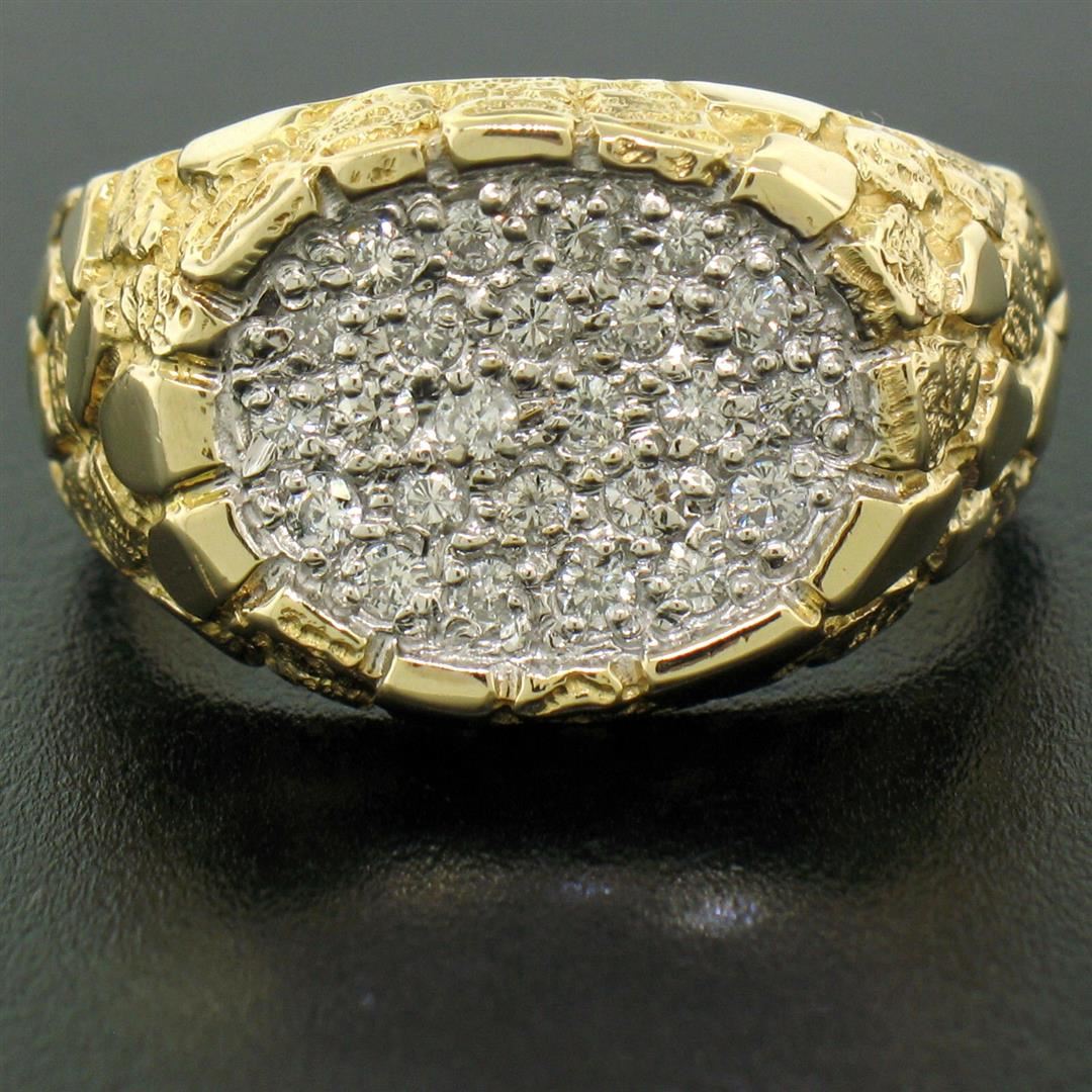 One NEW Men's 14K Two Tone Gold Nugget Texture 0.60ctw Oval Round Diamond Cluster Ring. Item Details: Material: Solid 14K Yellow and White Gold, Weight: 8.72 Grams, Stone(s): (24) Natural Genuine Diamonds - Round Brilliant Cut - Pavé Set - G/H Color - VS2/SI1 Clarity, Total Carat Weight: 0.60 (approx.), Ring Size: 9.5 , Ring Width: 14.20mm, Ring Height: 3.97mm rise off the finger, Condition: New w/o Tag!