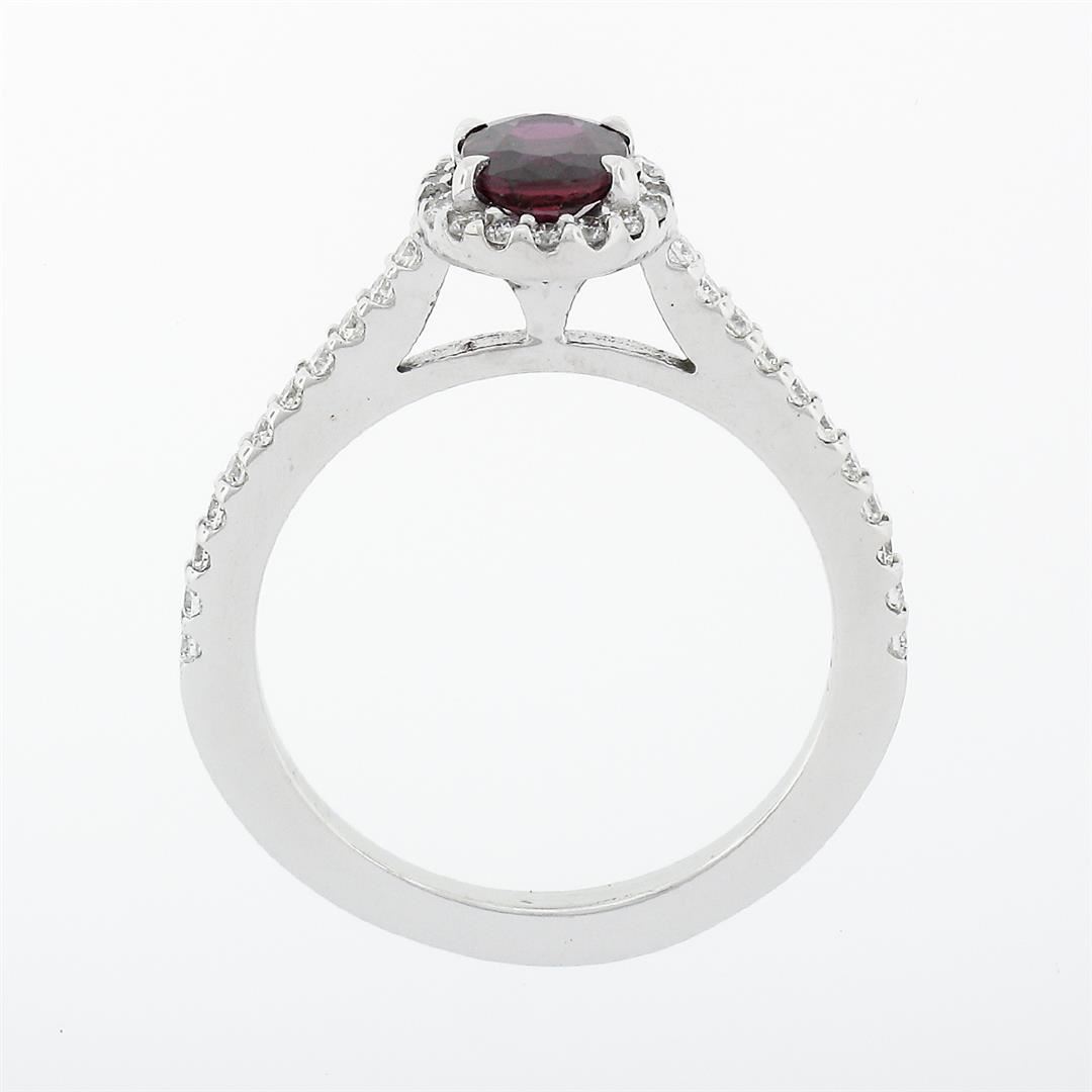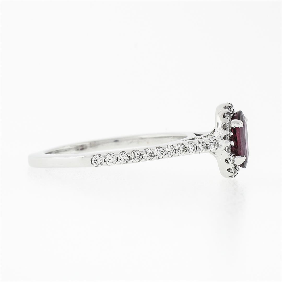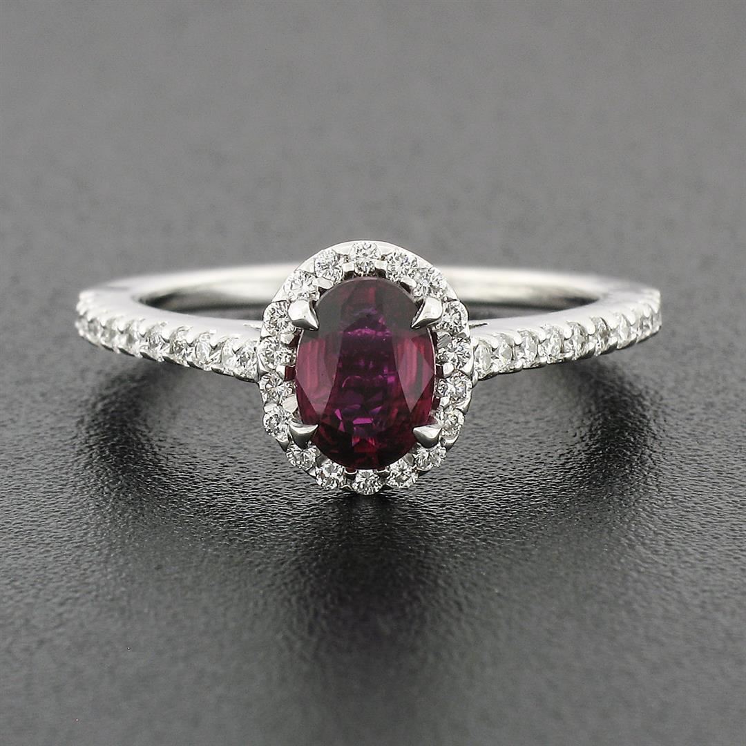 A new solid 14k white gold solitaire ring, featuring 1 oval brilliant cut natural ruby (0.80ctw), & 40 round brilliant cut natural diamonds (F/G- VS1/VS2; 0.60ctw). The ring is size 6.0, weighs a total of 2.89 grams, and measures 8.7mm wide.