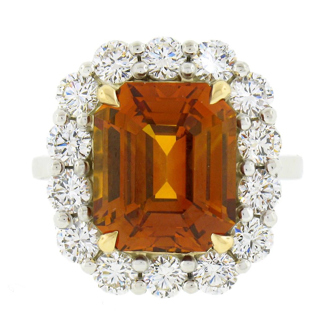 A new solid platinum & 18k yellow gold cocktail ring, featuring 1 GIA graded emerald step cut natural orange sapphire (8.61ct), surrounded with a halo of 14 round cut natural diamonds (F/G - VS1/VS2 ; 2.13ctw). The ring is size 6.0, weighs a total of 13.29 grams, and measures 19.5mm wide. Comes with all original relevant certifications.