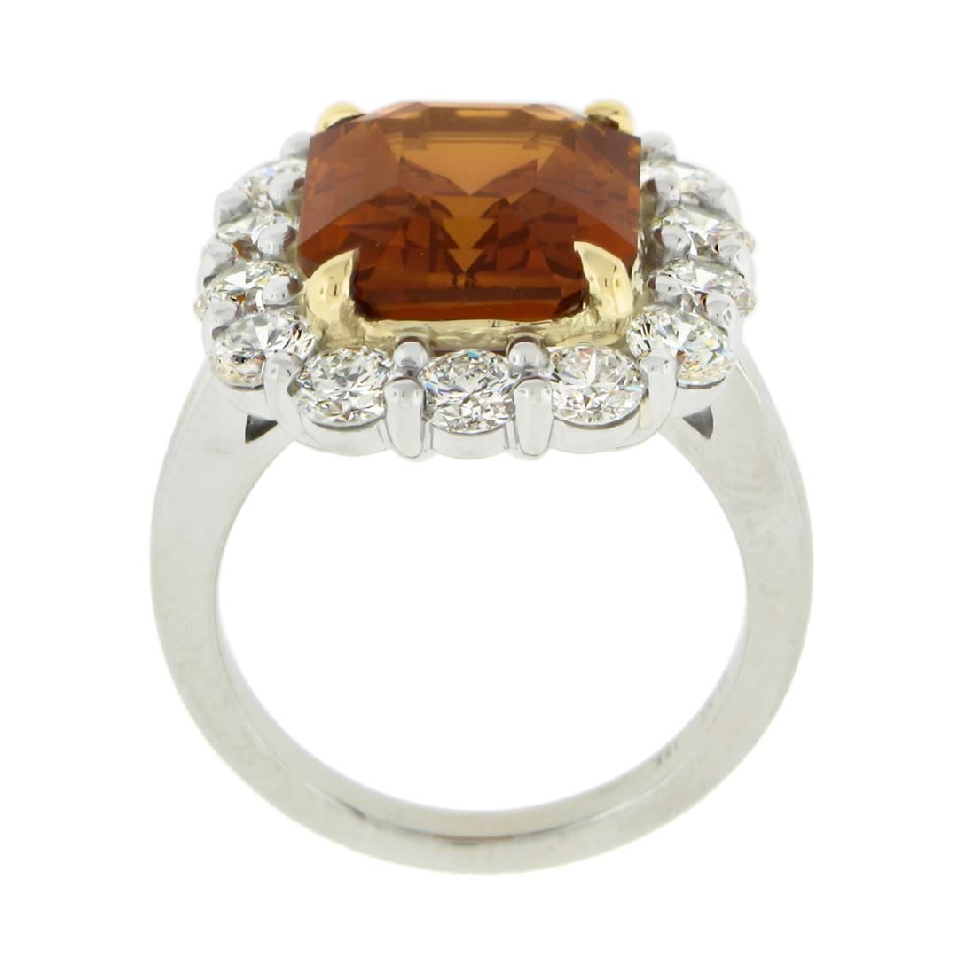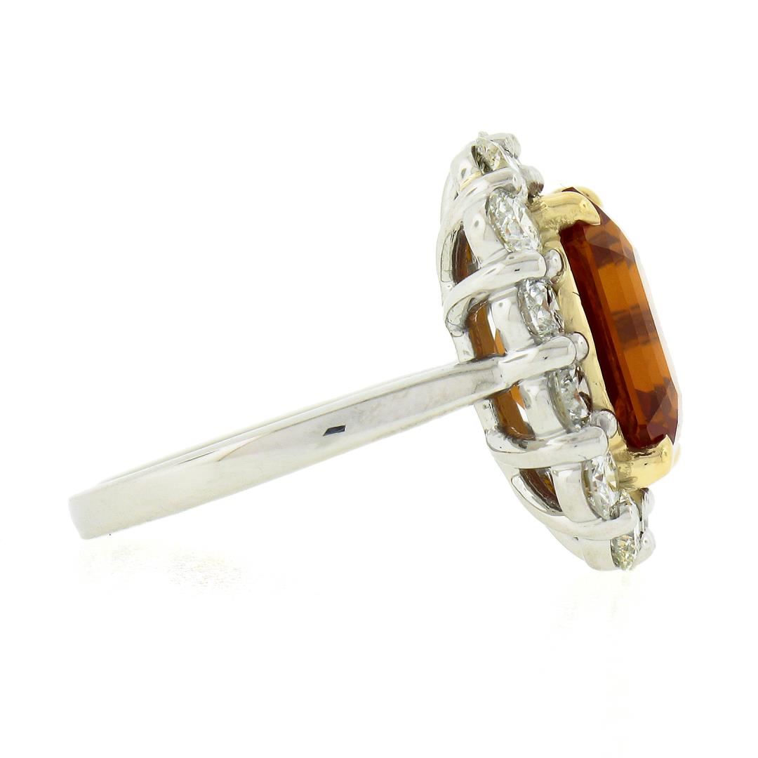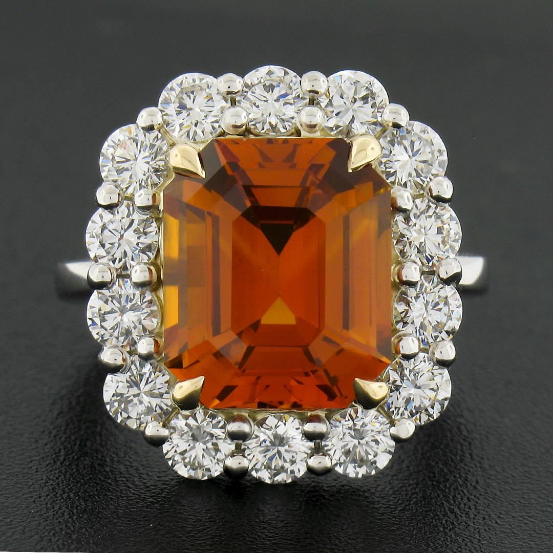 A new solid platinum & 18k yellow gold cocktail ring, featuring 1 GIA graded emerald step cut natural orange sapphire (8.61ct), surrounded with a halo of 14 round cut natural diamonds (F/G - VS1/VS2 ; 2.13ctw). The ring is size 6.0, weighs a total of 13.29 grams, and measures 19.5mm wide. Comes with all original relevant certifications.