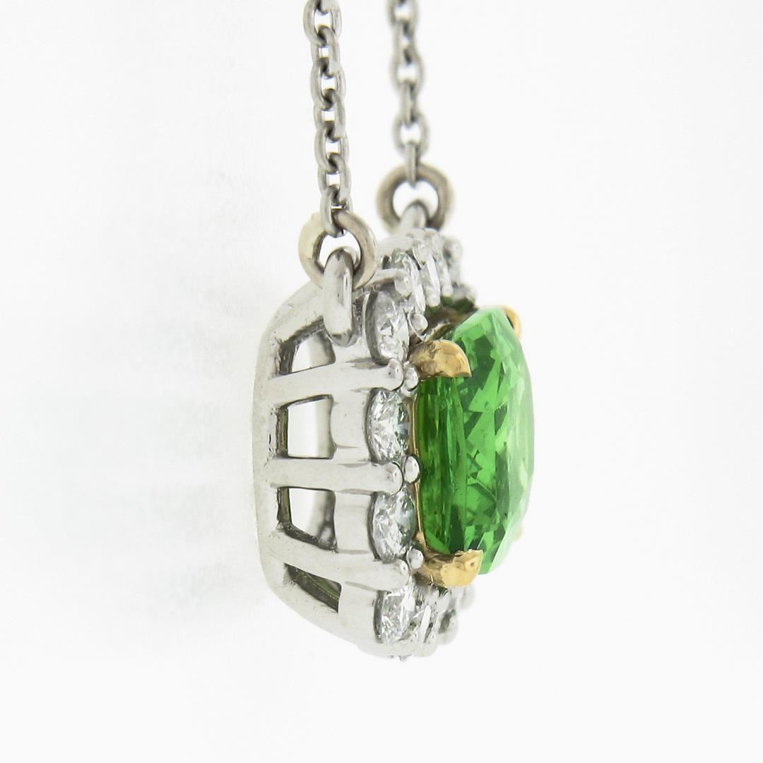 A new solid platinum & 18k yellow gold pendant necklace, with 1 GIA graded cushion cut natural tsavorite (2.08ct), surrounded with a halo of 14 round brilliant cut natural diamonds (G/H - VS1/VS2 ; 0.60ctw). 19 inch cable link chain, 6.14 grams total weight, pendant measures 11.2x13.35mm. Comes with all original relevant certifications.