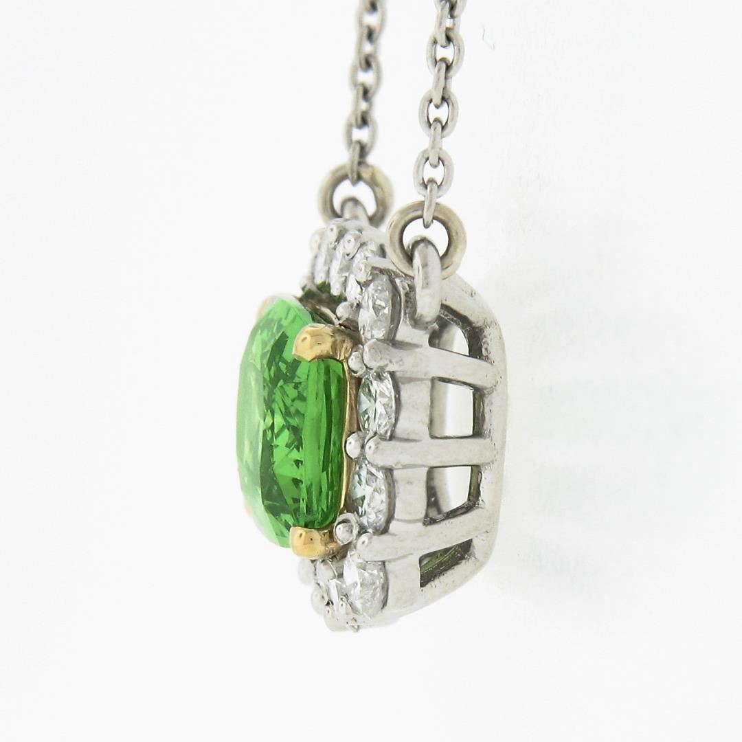 A new solid platinum & 18k yellow gold pendant necklace, with 1 GIA graded cushion cut natural tsavorite (2.08ct), surrounded with a halo of 14 round brilliant cut natural diamonds (G/H - VS1/VS2 ; 0.60ctw). 19 inch cable link chain, 6.14 grams total weight, pendant measures 11.2x13.35mm. Comes with all original relevant certifications.