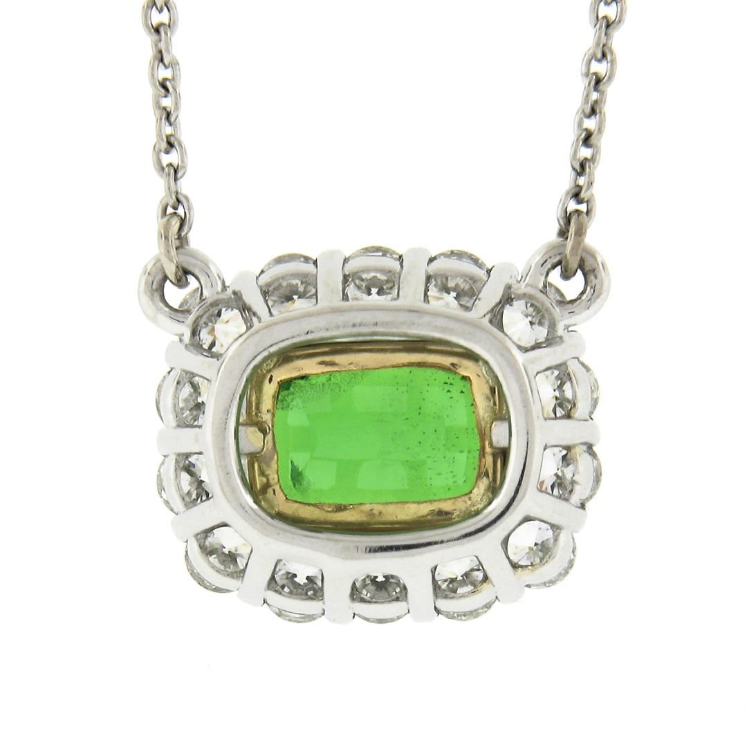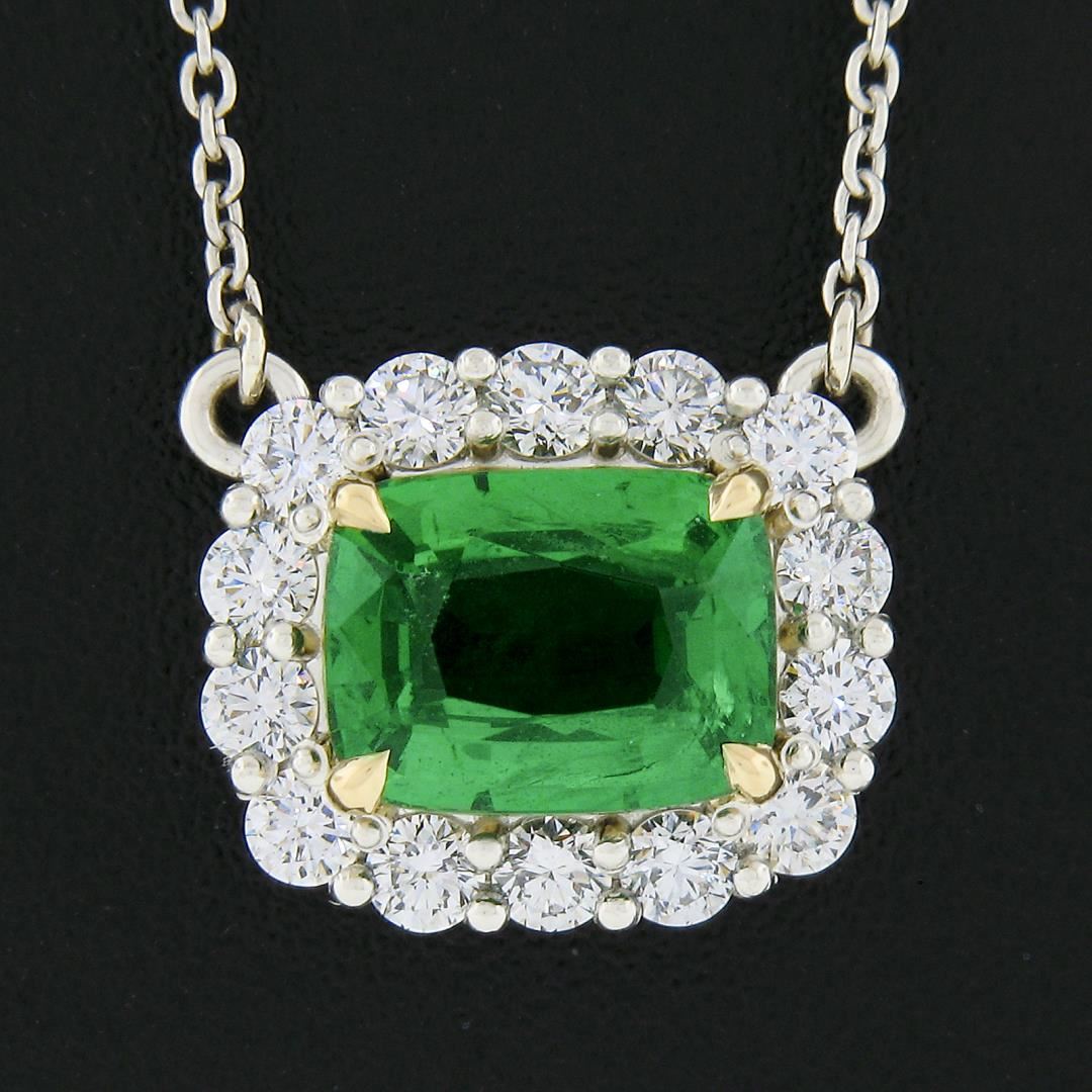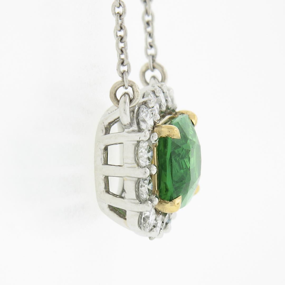 A new solid platinum & 18k yellow gold pendant necklace, with 1 GIA graded cushion cut natural tsavorite ( 2.04ct), surrounded with a halo of 14 round brilliant cut natural diamonds (G/H - VS1/VS2 ; 0.60ctw). 18.5 inch cable link chain, 5.79 grams total weight, pendant measures 11x13mm. Comes with all original relevant certifications.